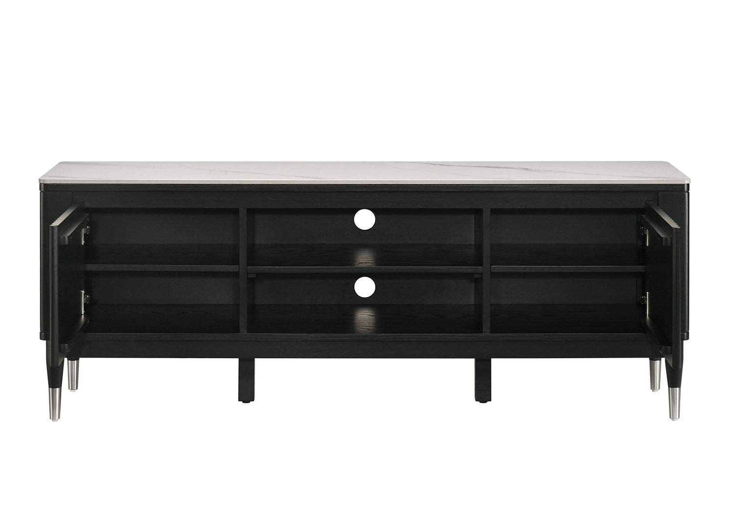 Contemporary Style TV Console Sintered Stone Top Silver Capped Arrow Legs Open Shelves Black And White Finish Primary Living Room