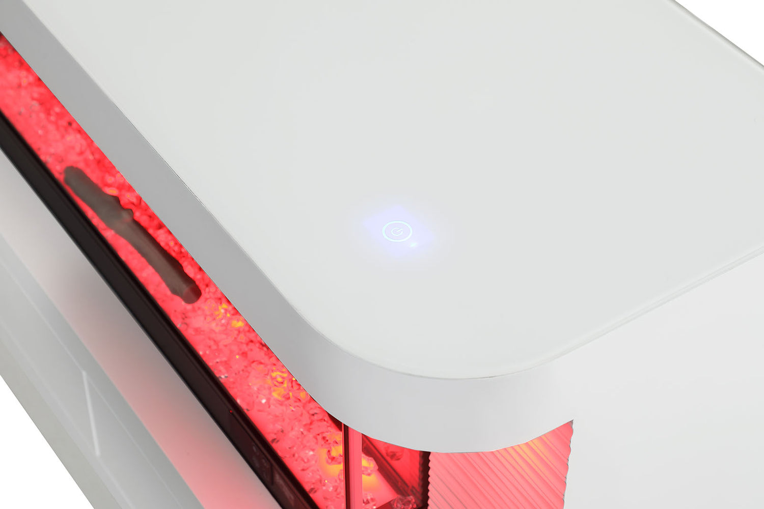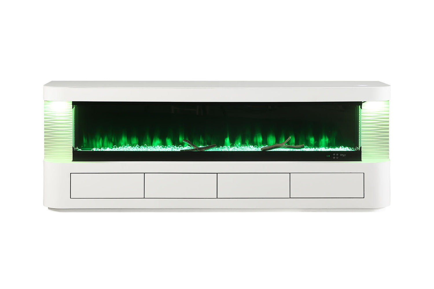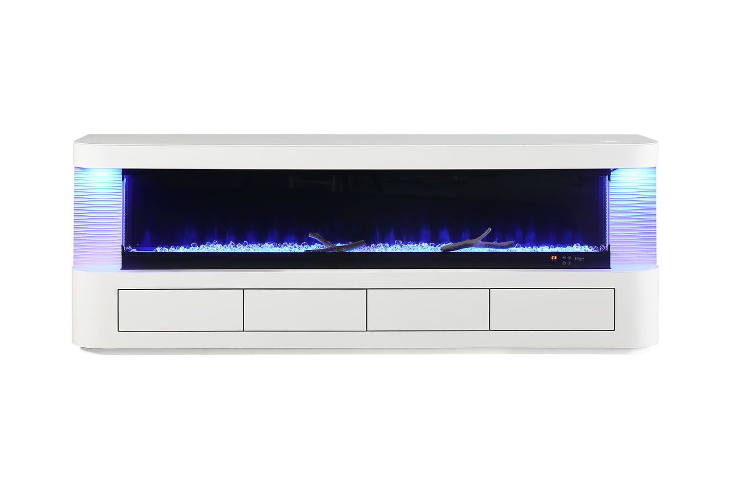 Contemporary clean lines, minimal ornamentation, modern silhouette. White finish, which gives it a bright, neutral look that pairs with many décor color schemes. A mix of engineered wood, pine, metal, and glass. Includes drawers, shelves, and the electric fireplace insert. The fireplace is meant for aesthetic / ambient effect; some listings note ‘no heater” (i.e., flame effect without heat) while others emphasize typical electric fireplace features (brightness levels, timer).
