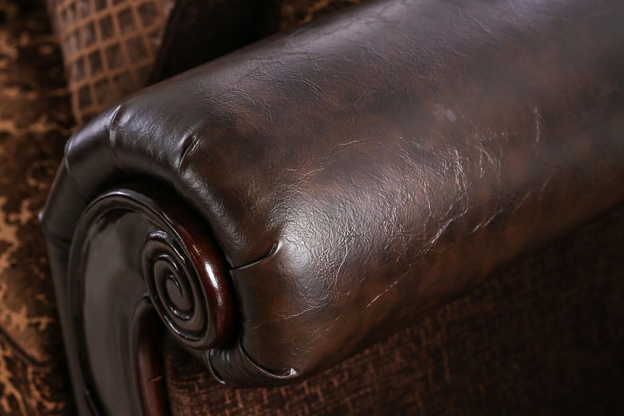 Visitors will wonder if they wandered into a palace when they enter and find this ornate love seat awaiting them. An elaborate wooden trim decorates the base and front of the rolled armrests and continues the frame to accentuate the top of the backrest. Sleek faux leather lines the flared arms and back while sumptuous chenille fabric covers the seat cushions in soft luxury. Resting atop elegantly turned bun feet, this love seat will earn your decorating respect and grant your home a majestic air.