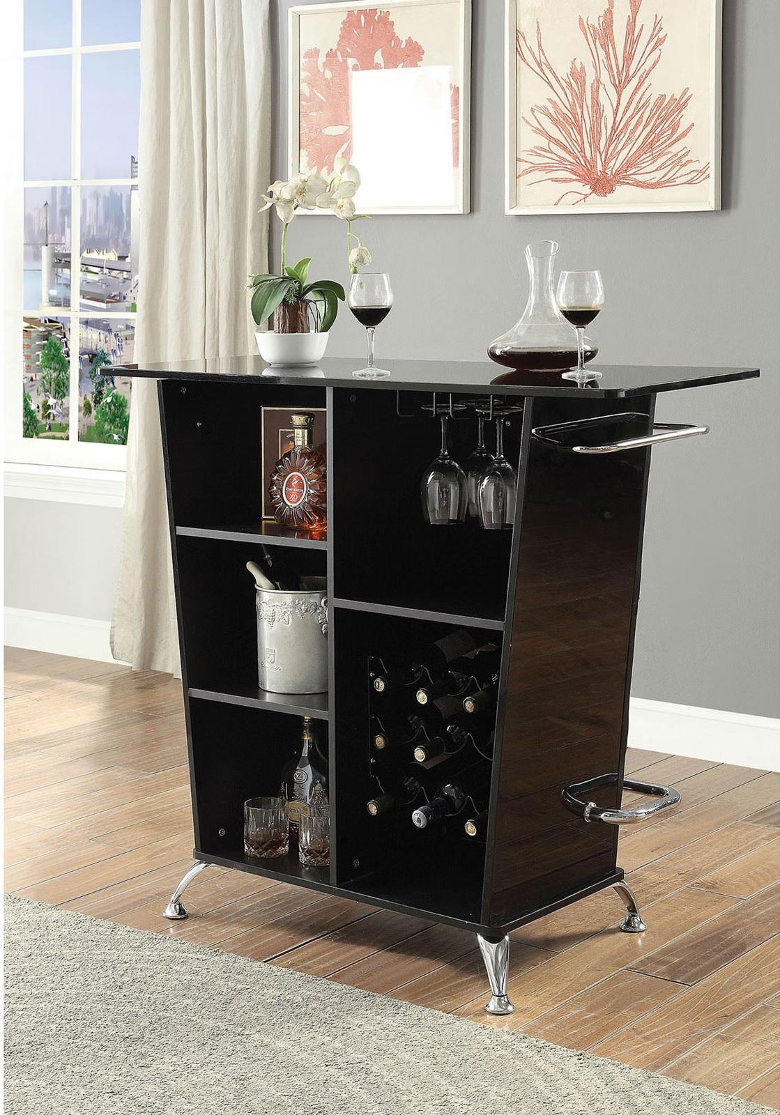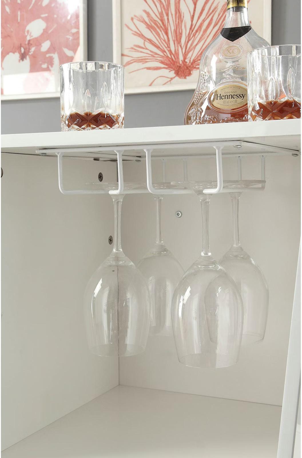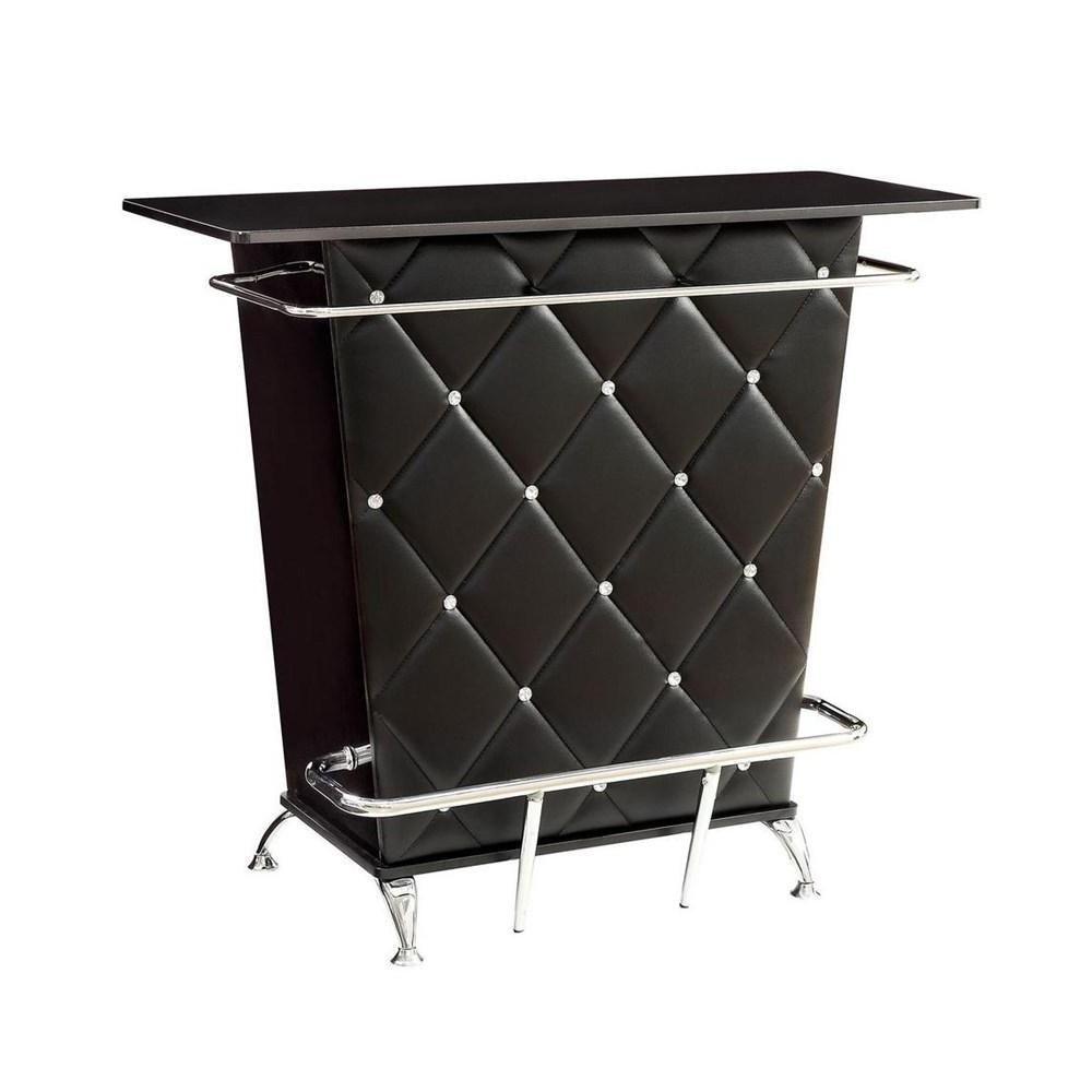 This deliciously modern bar table is all about the glam. This bar features a glossy lacquer coating, shining chrome bar handles and legs, and a button tufted siding make for an eclectic blend of textures and materials that set the mood for a fun night of drinks.