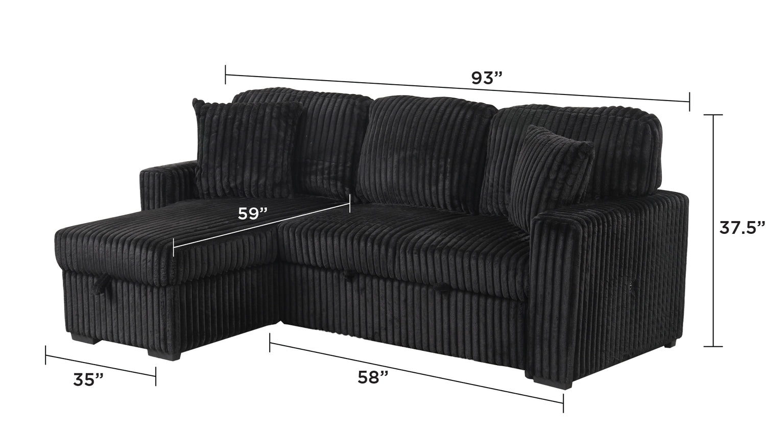 - Reversible chaise with hidden storage keeps essentials like blankets and pillows neatly organized and offers flexibility in room layout