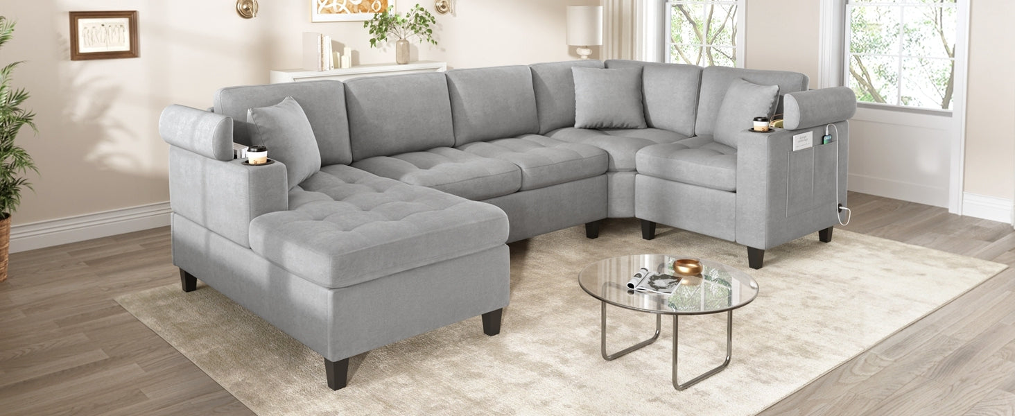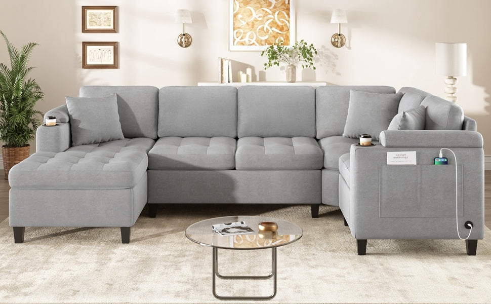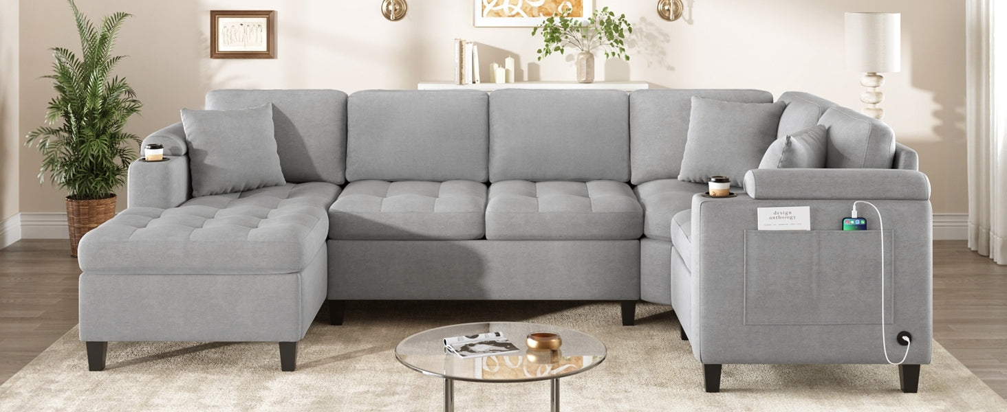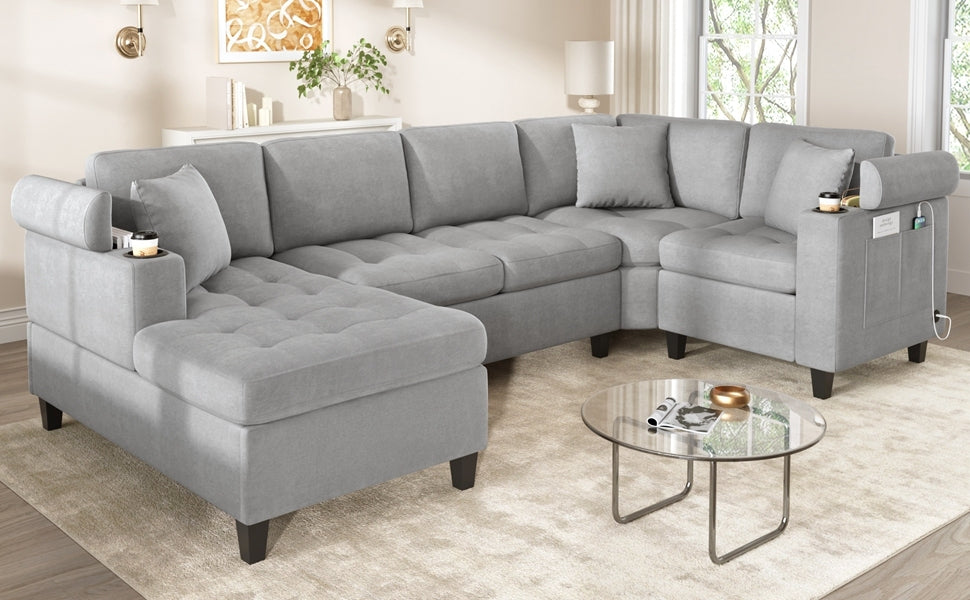 Modern U-shaped Sectional Sofa 115.7' Corner Living Room Couch with Built-in Cup Holders, Storage, USB Ports in Light Grey Chenille Fabric is available