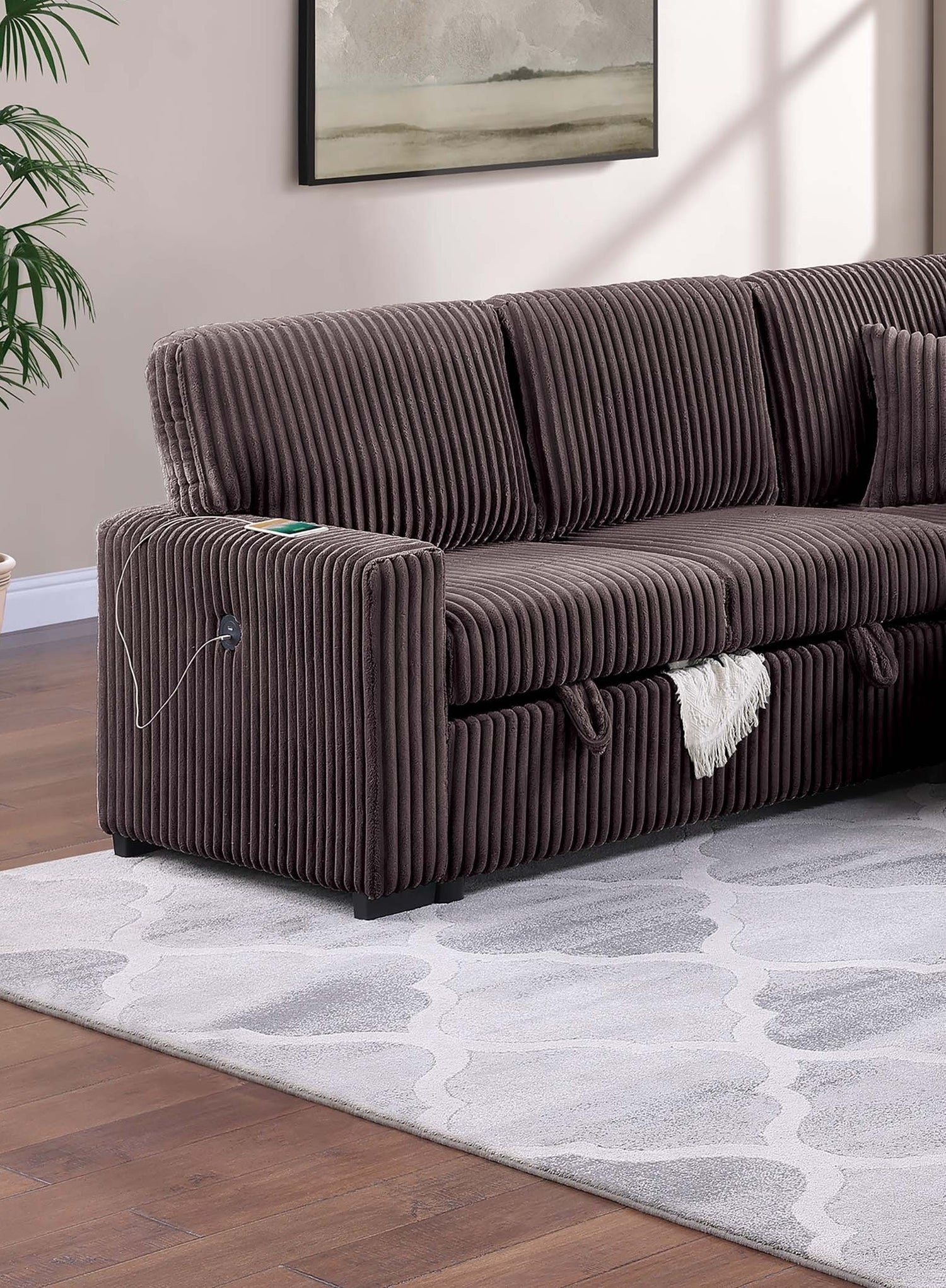 Transform your living space with the ultimate blend of comfort, function, and versatility. This 4-Piece Convertible Sectional offers multiple seating arrangements and hidden features designed to keep your home both stylish and practical. Upholstered in soft fur-like corduroy, this sectional creates a cozy and inviting atmosphere, perfect for daily lounging, family gatherings, or overnight guests. The set includes a Reversible Sleeper Sofa, a Right Arm Facing Storage Chaise, a Reversible Storage Sofa with USB Port, and a Corner Wedge, giving you the flexibility to configure the layout to fit your room. The sleeper sofa is easy to use—just pull from the base to reveal an extra sleeping area, making it an excellent solution for hosting guests without taking up permanent space.