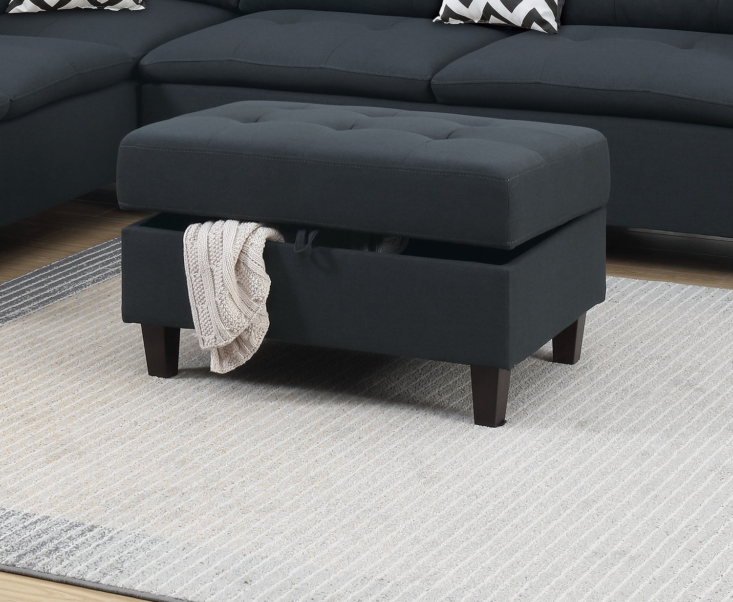 Living Room Furniture Black Cushion Sectional w Ottoman Linen Like Fabric Sofa Chaise
