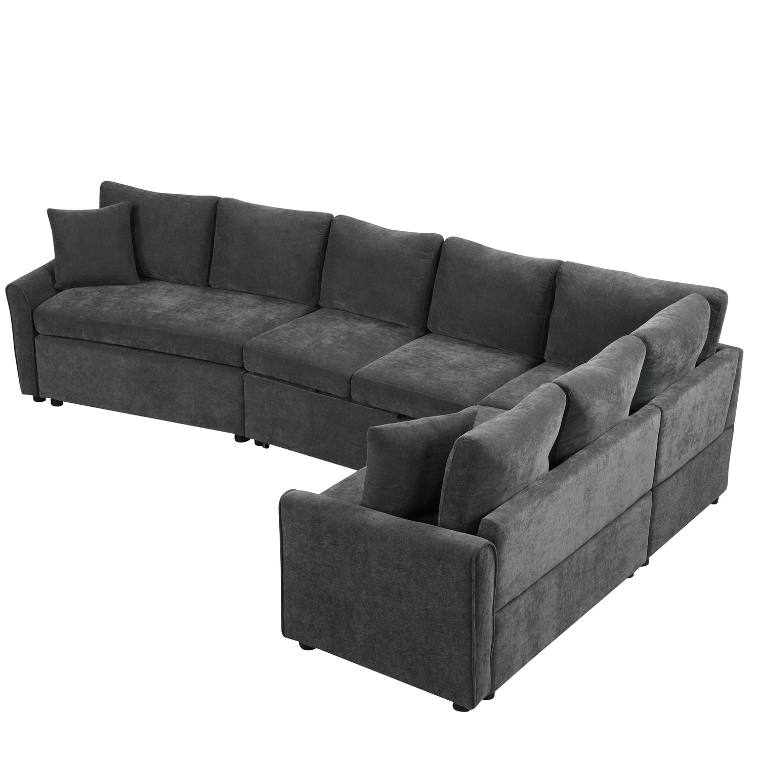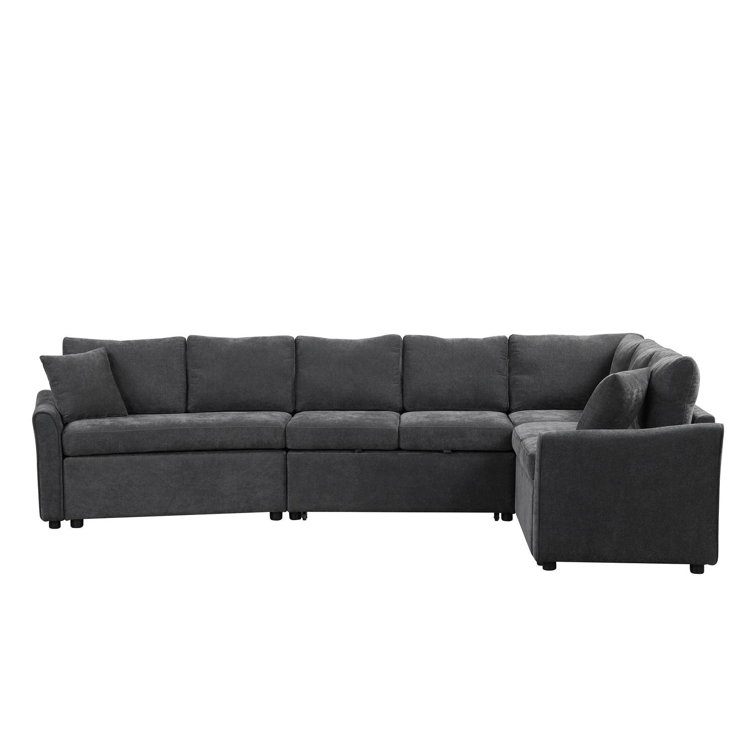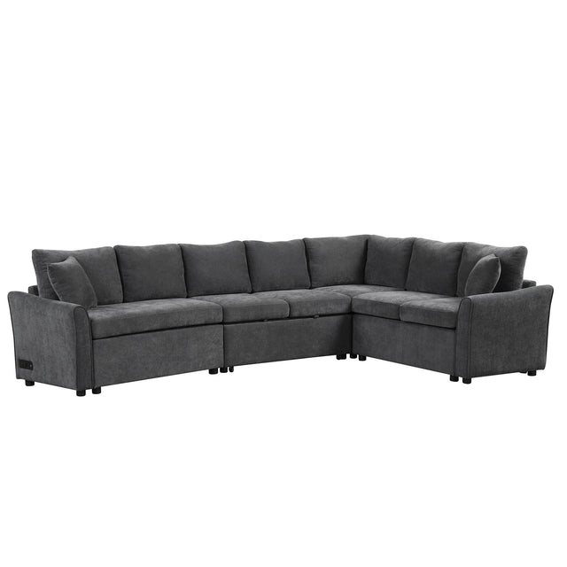Gray Convertible L-shaped Sofa Bed with USB Ports, Power Sockets and Back Pillows in Chenille Fabric