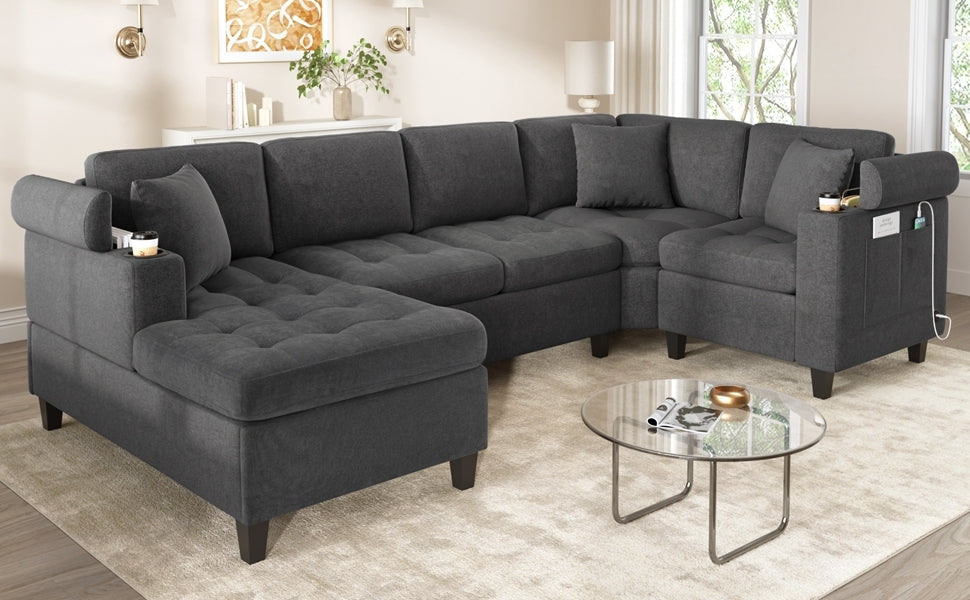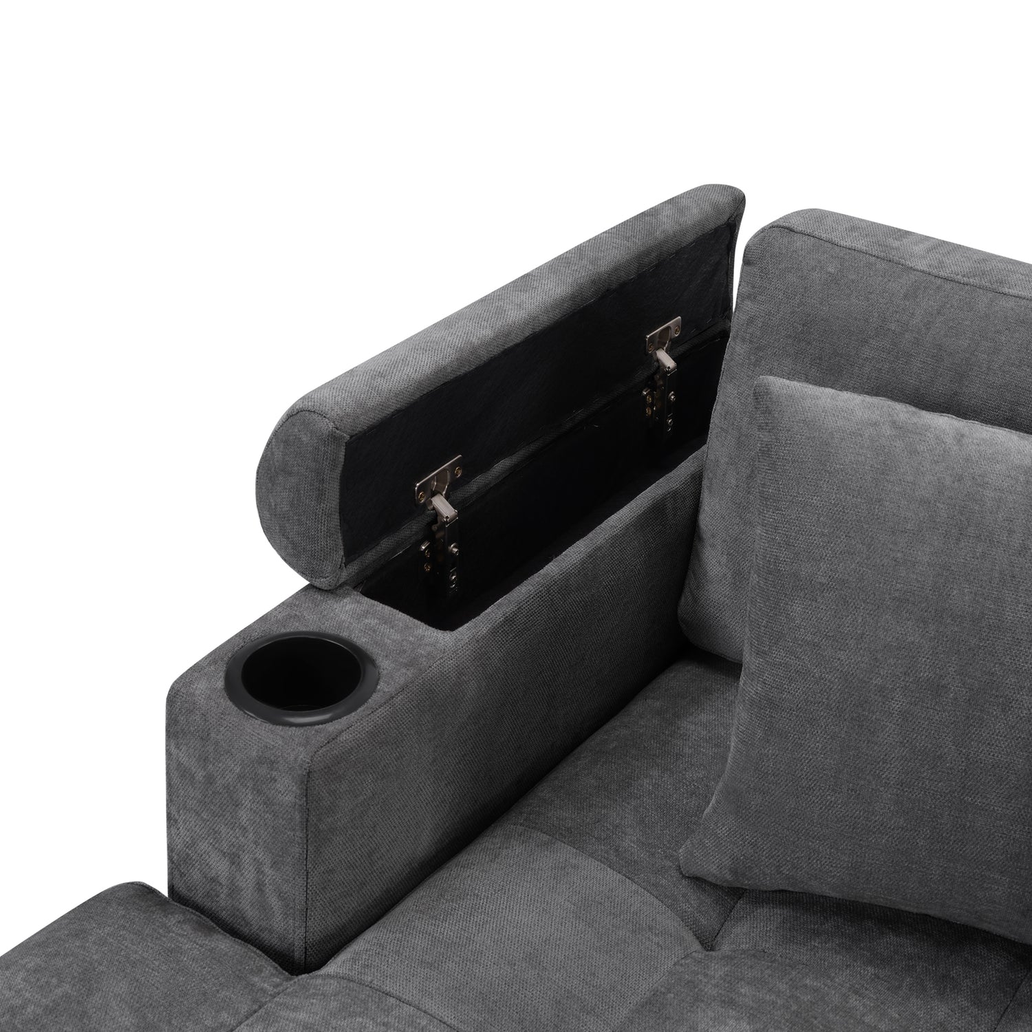 Modern U-shaped Sectional Sofa 115.7' with Built-in Cup Holders, Storage, USB Ports in Grey Chenille Fabric