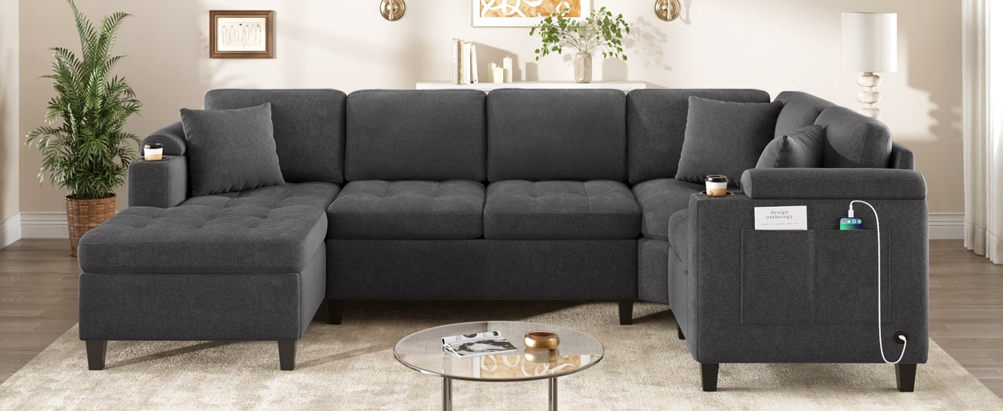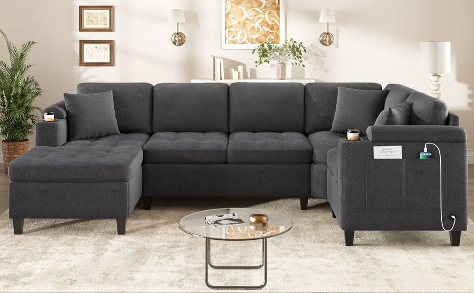 Modern U-shaped Sectional Sofa 115.7' with Built-in Cup Holders, Storage, USB Ports in Grey Chenille Fabric is available