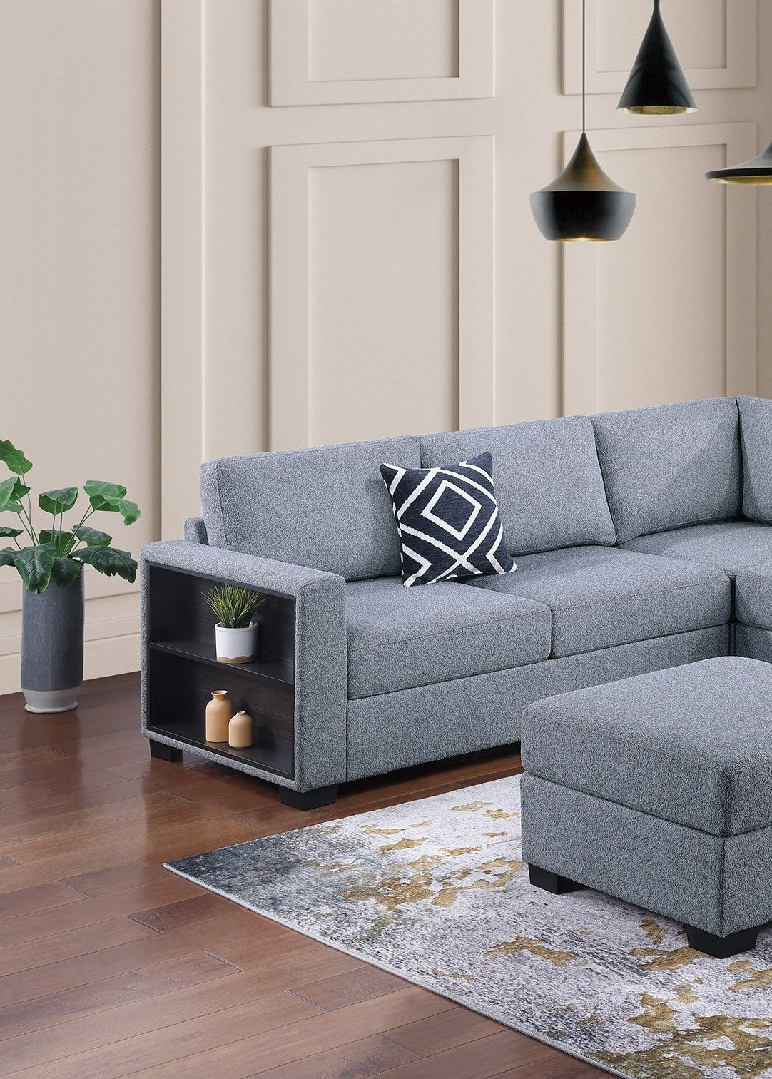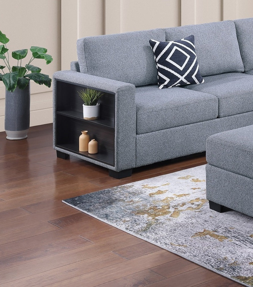 Contemporary Functional Sectional Sofa 4pc Set Gray Boucle Couch Loveseat w Built-in Shelfs Wedge, Ottoman Living Room Furniture L-Shaped Design Couch is available