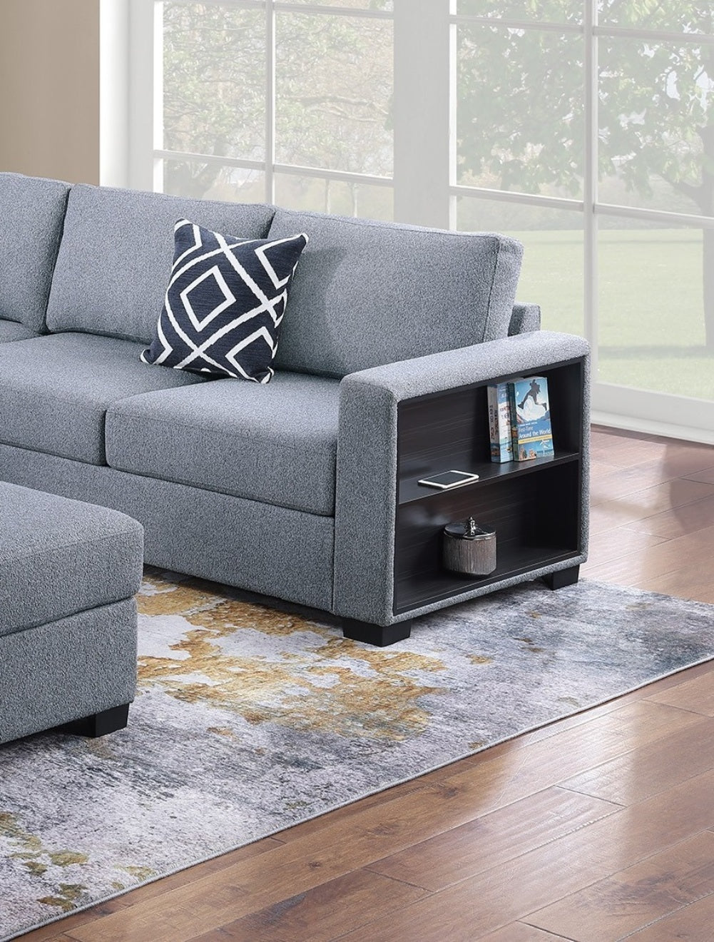 Listing Includes - 4pc Sectional Sofa Set (RAF/LAF One-Arm Loveseat W/ Built-In Shelf, Corner Wedge, Cocktail Ottoman) Only.