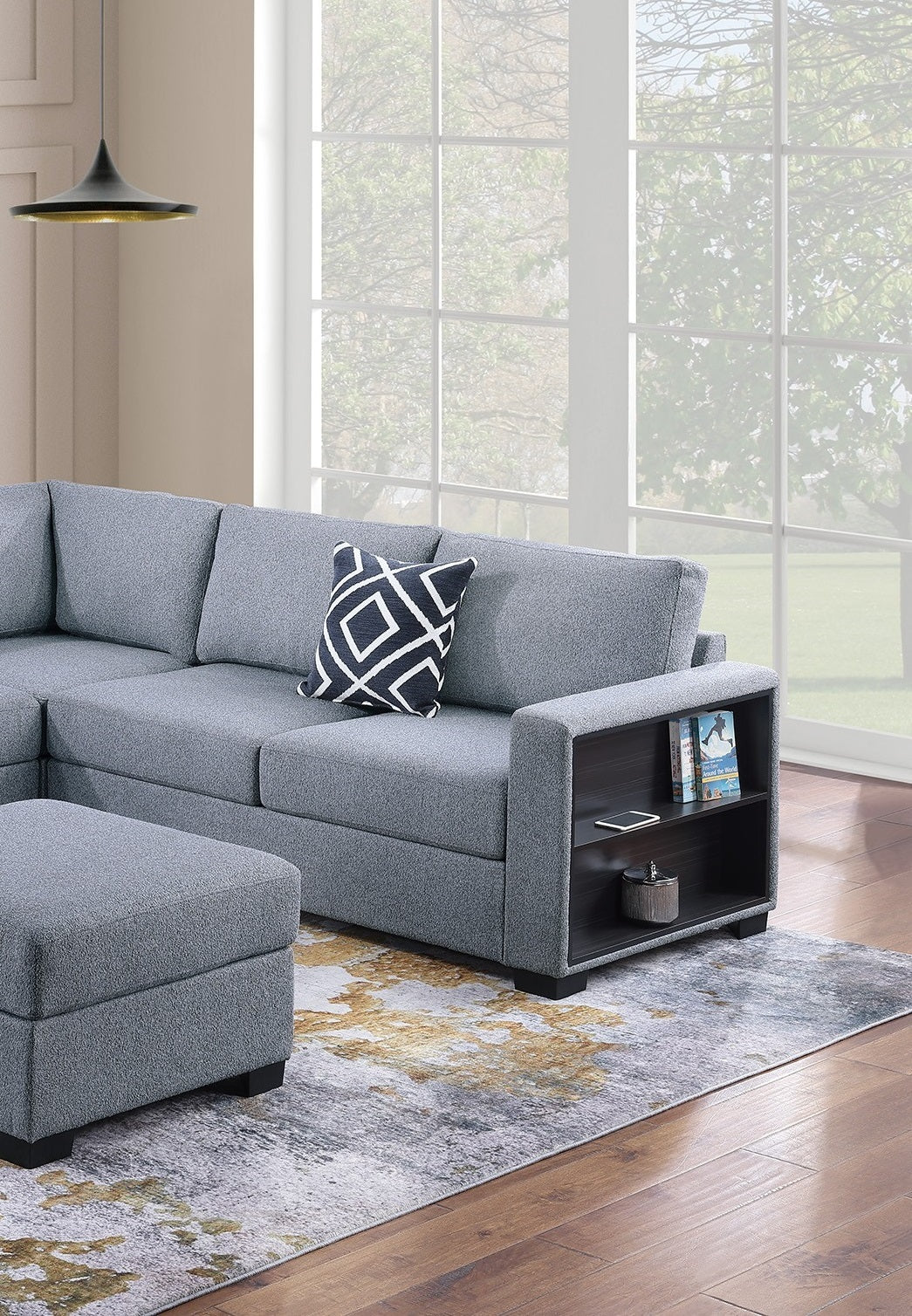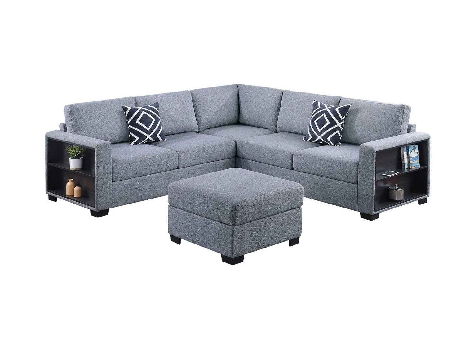 - Listing Includes - 4pc Sectional Sofa Set (RAF/LAF One-Arm Loveseat W/ Built-In Shelf, Corner Wedge, Cocktail Ottoman) Only.