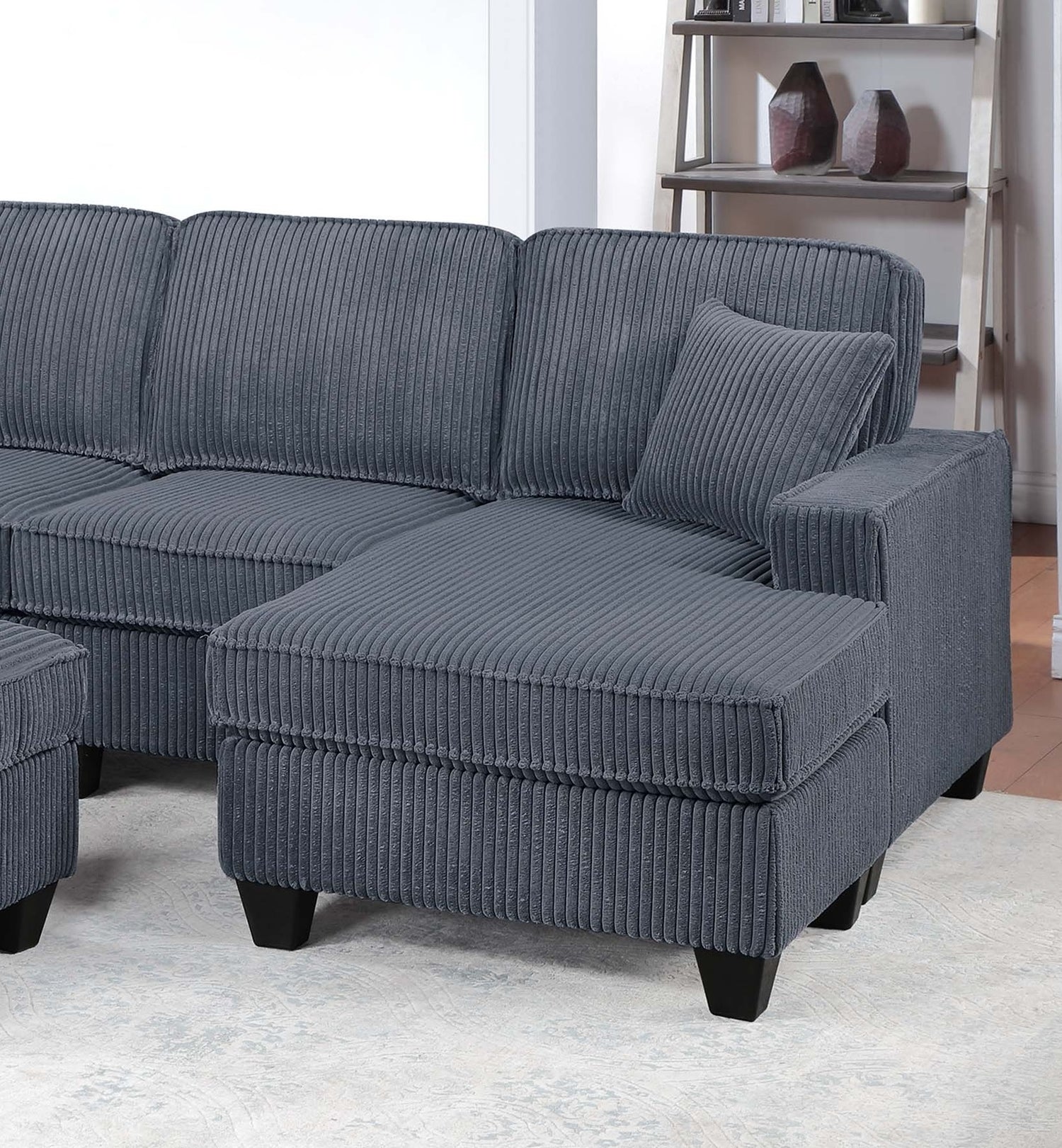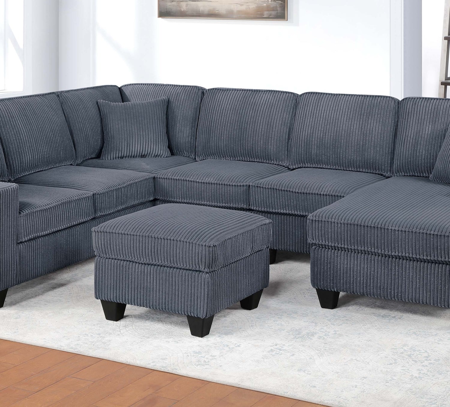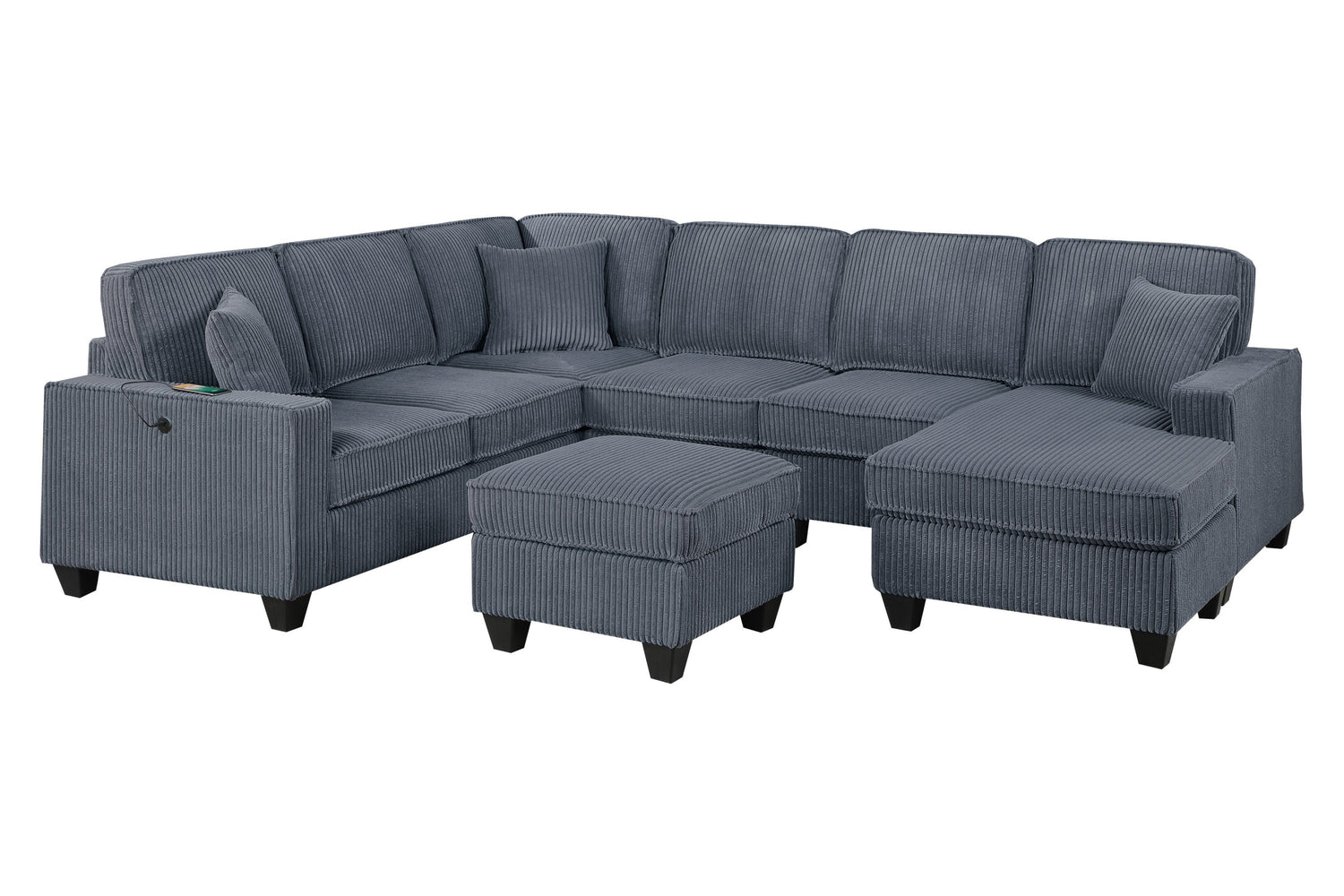 This 5-Piece Sectional Set redefines your living space with modern elegance. Crafted in plush corduroy, this sectional seamlessly combines style with functionality. Thoughtfully designed for both function and flow, this collection forms a spacious U-shaped layout—perfect for movie nights, weekend gatherings, or stretching out solo after a long day. Wrapped in ultra-soft corduroy, every inch of this sectional invites you to sink in and relax. The distinct texture brings warmth and character to your space, while the plush seat and back cushions provide an inviting feel you can enjoy every day. Whether you're sitting upright for conversation or reclining into your favorite lounging position, this sectional supports the rhythm of real life. This set includes five distinct pieces that come together to create a seating arrangement that feels tailored to your space. The RAF Loveseat with Chaise offers a generous place to kick up your feet, while the LAF Loveseat with USB ports gives you a convenient charging station right at your side—perfect for keeping your devices close and powered without interrupting your downtime. At the center, the Corner Wedge smoothly connects each arm, creating an open U-shape that encourages face-to-face conversations and easy flow. The Armless Chair seamlessly blends into the layout, offering additional seating without breaking the clean lines of the design. Completing the ensemble is the Cocktail Ottoman an adaptable piece that works as a footrest, extra seat, or even a casual table for serving trays and books. Move it where you need it most—it’s as flexible as your lifestyle. With its tailored proportions