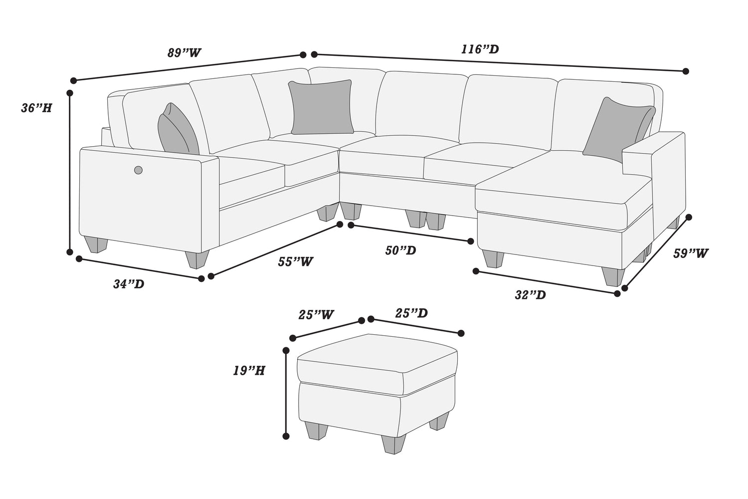 RAF Loveseat W/ Chaise: 55' x 59' x 36' H