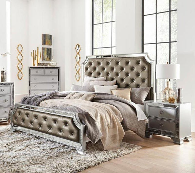 The reflection of your glamorous image is one of striking style and classic sophistication, all illuminate by the boldly designed Avondale Collection. Mirrored framing immediately draws your eye to the modern-traditional profile of the case goods and bed as do the clipped corners on the bed mirror and vanity. Silver finished drop pull hardware centers each bead-molding adorned drawer front. The silver finish of the collection is illuminated not only by the reflected light off the mirrors, but it is also enhanced by the contrasting silver-gray crystal button-tufted accents on the headboard and footboard. Beyond the traditional case goods that are offered, an available vanity further enhances your space. Glass is mounted between the two vanity drawer units. Jewelry hooks provide convenient storage behind the folding mirrors and the available coordinating stool complements the collection.