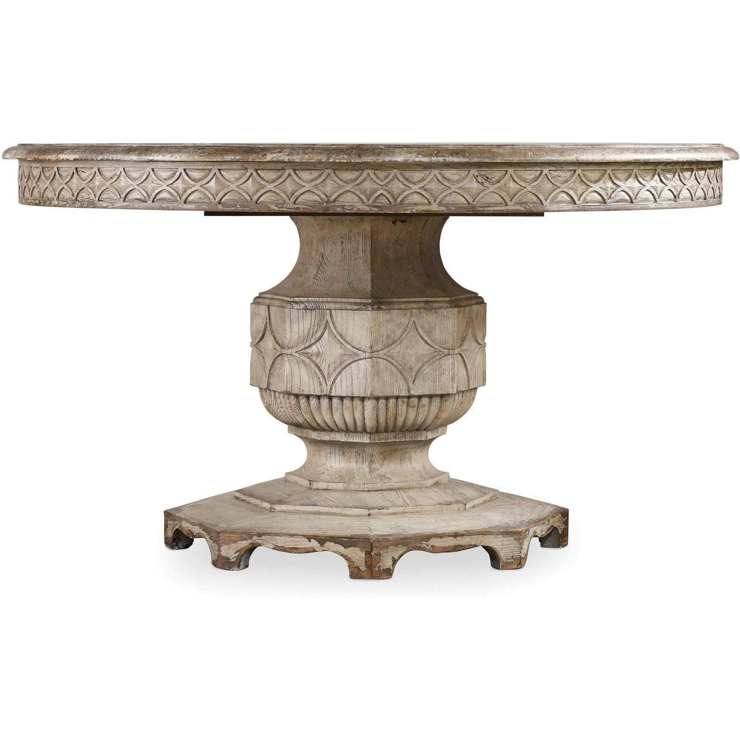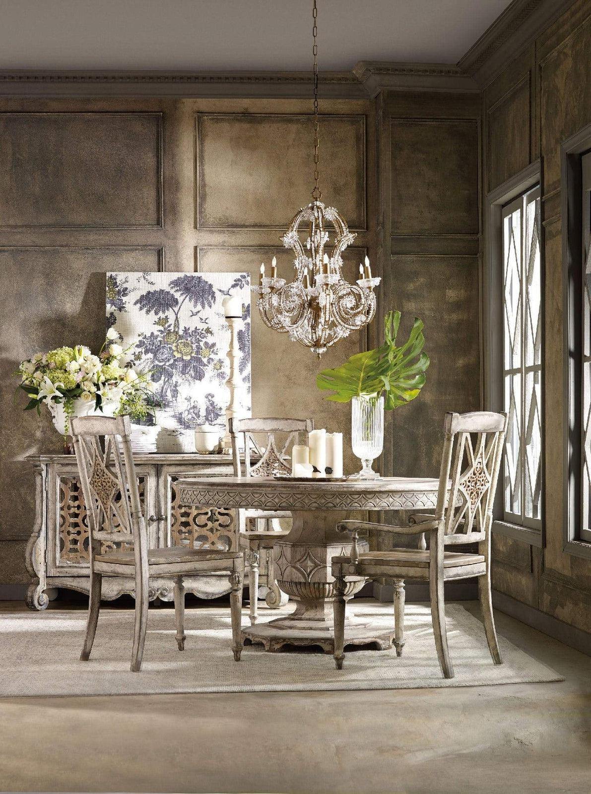 Experience livable luxury with the Chatelet Round Dining Table by Hooker Furniture, inspired by timeless farm-style antiques of Old World Europe. Graceful and refined, this table features a scalloped fretwork apron and a beautifully shaped pedestal base for a truly elegant dining statement.