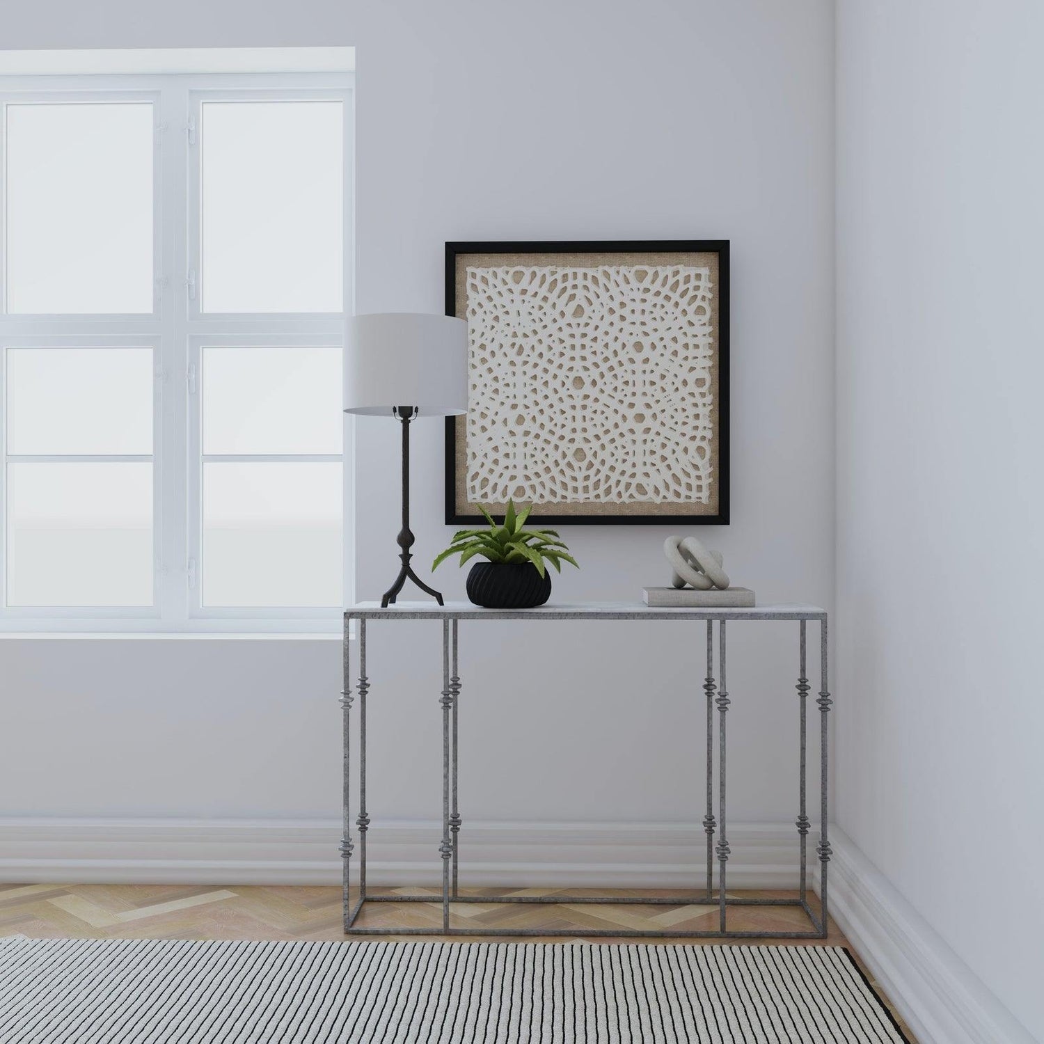 Elevate narrow spaces with the Stone & Metal Console Table—a stylish fusion of metalwork and marble, designed to bring modern texture and calm elegance to your space.