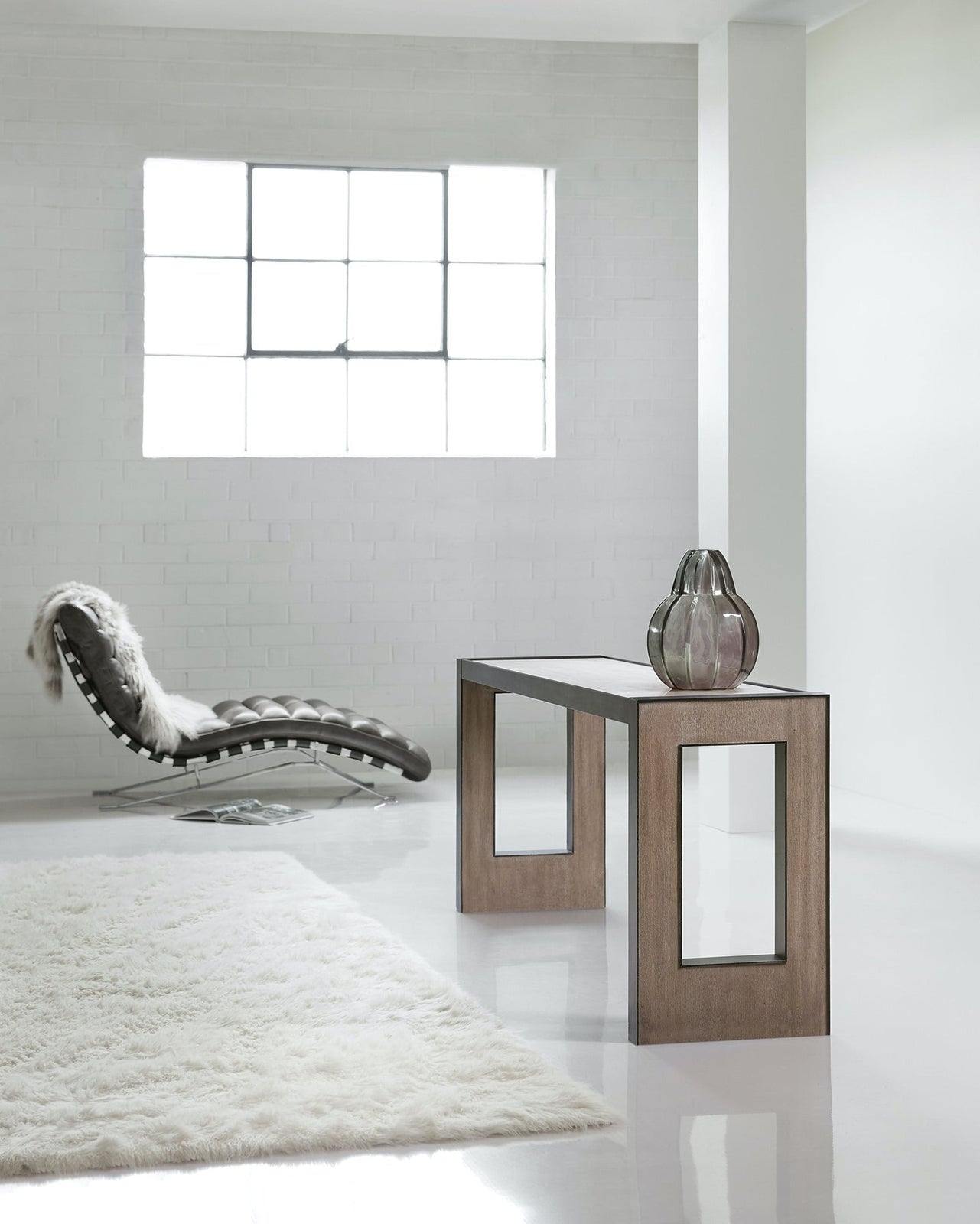Bring a sense of serenity and balance into your living space with the Melange Joni Console Table by Hooker Furniture. Crafted with artistic intent, this stunning console showcases a light wood finish over oak veneers, accented with oil-rubbed aluminum trim that adds subtle industrial flair.
