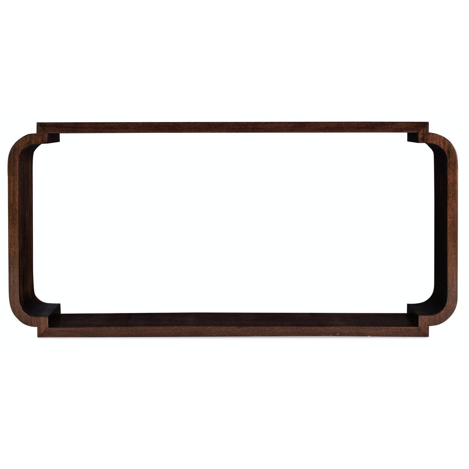 Gracefully curved wood sides and an open base design create a light, airy look while allowing room for displaying décor or storage baskets. The warm dark wood finish brings timeless elegance to any transitional or modern interior.