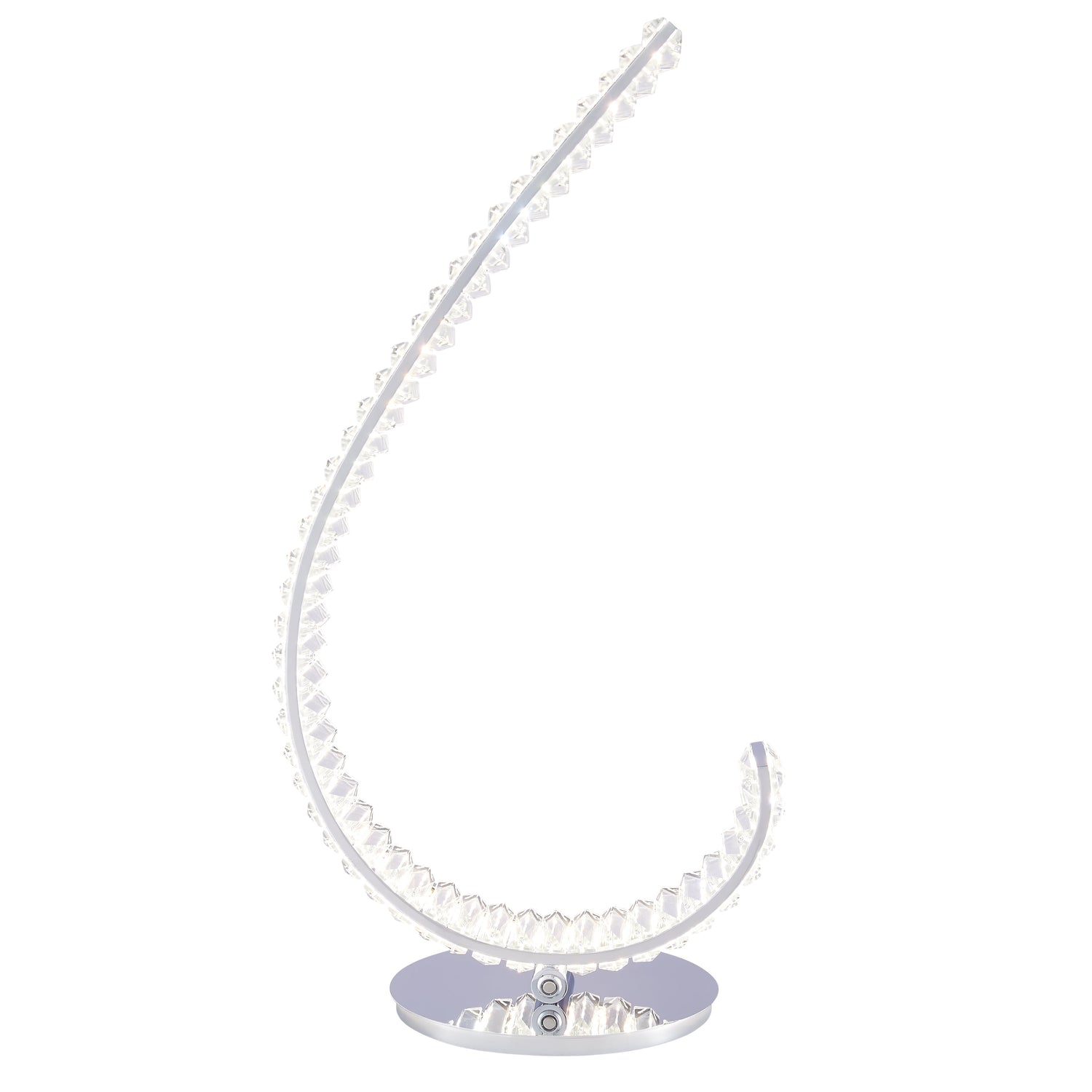 This beautiful table lamp is composed of a chrome base and frame aligned with an LED strip and adorned with crystals throughout both sides of the tower.