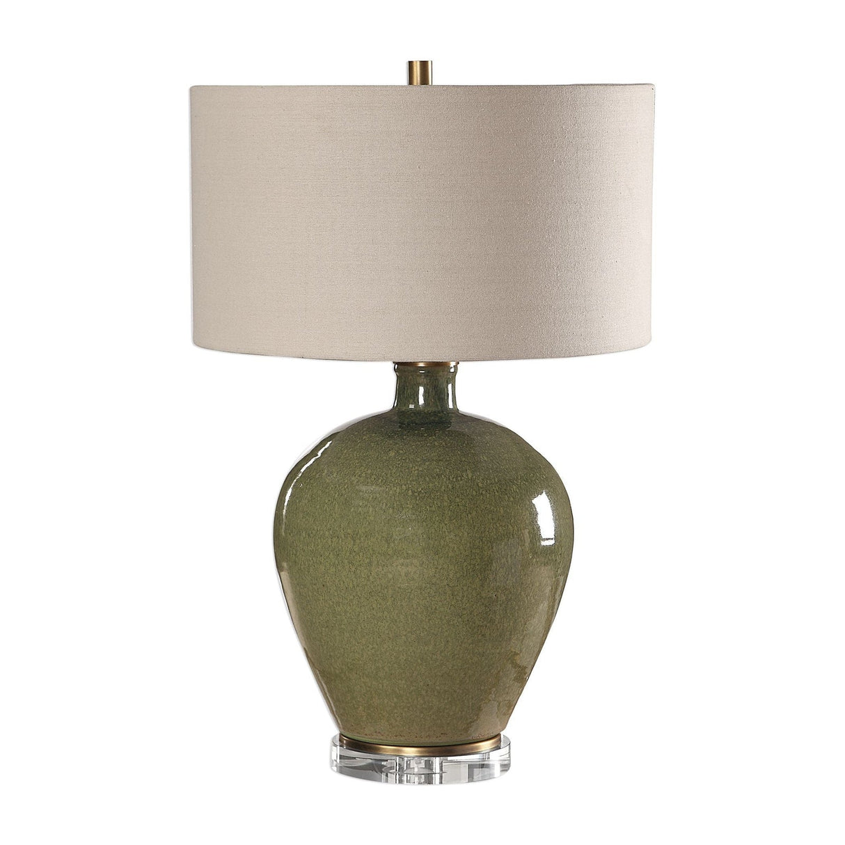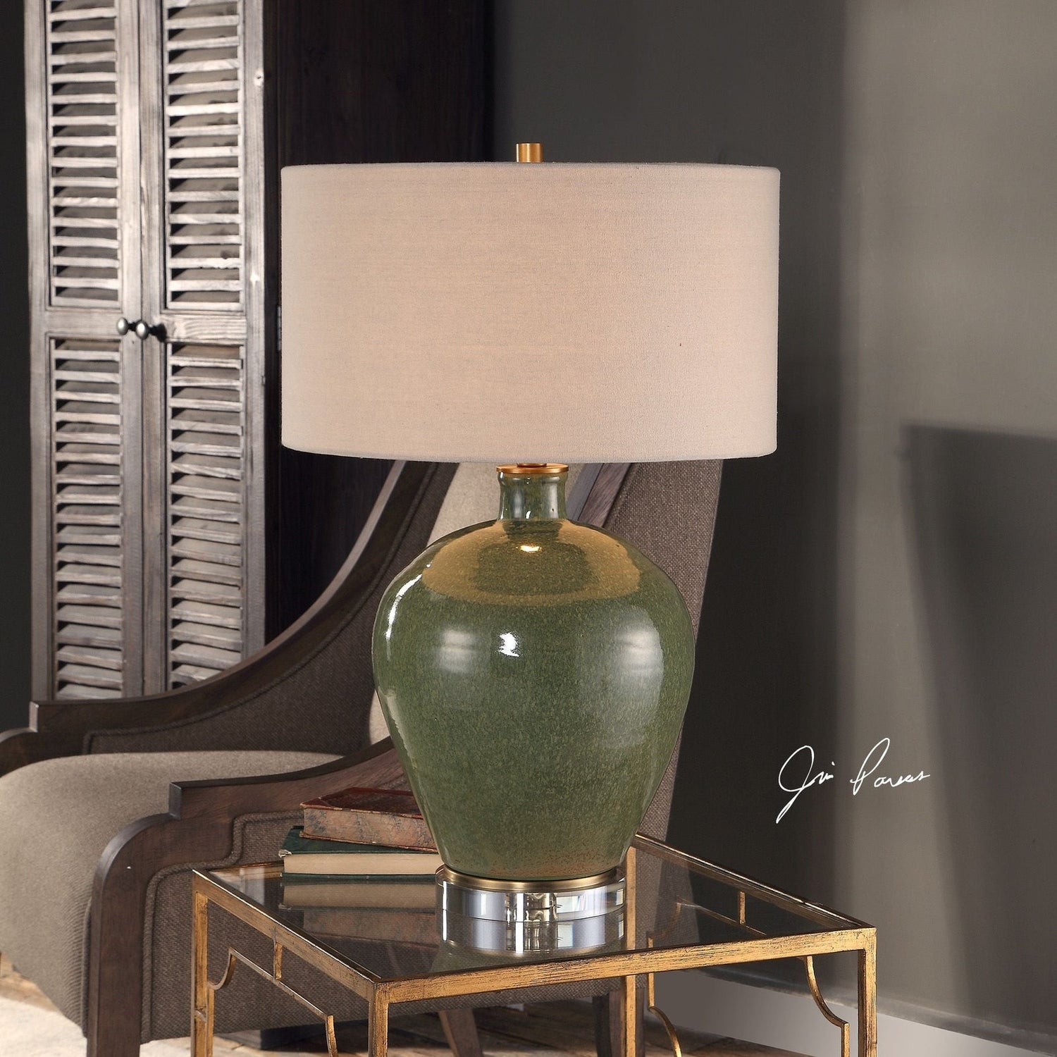 • This Ceramic Base Is Finished In A Distressed Emerald Green Glaze, Accented With Antique Brass Plated Details And A Crystal Foot.