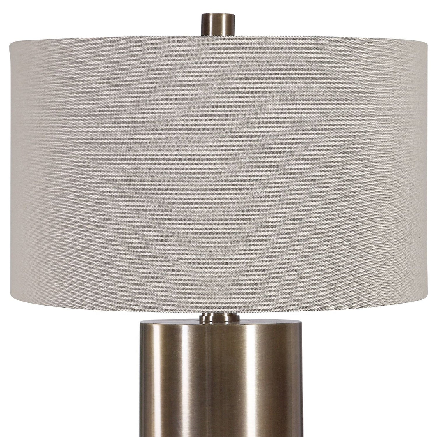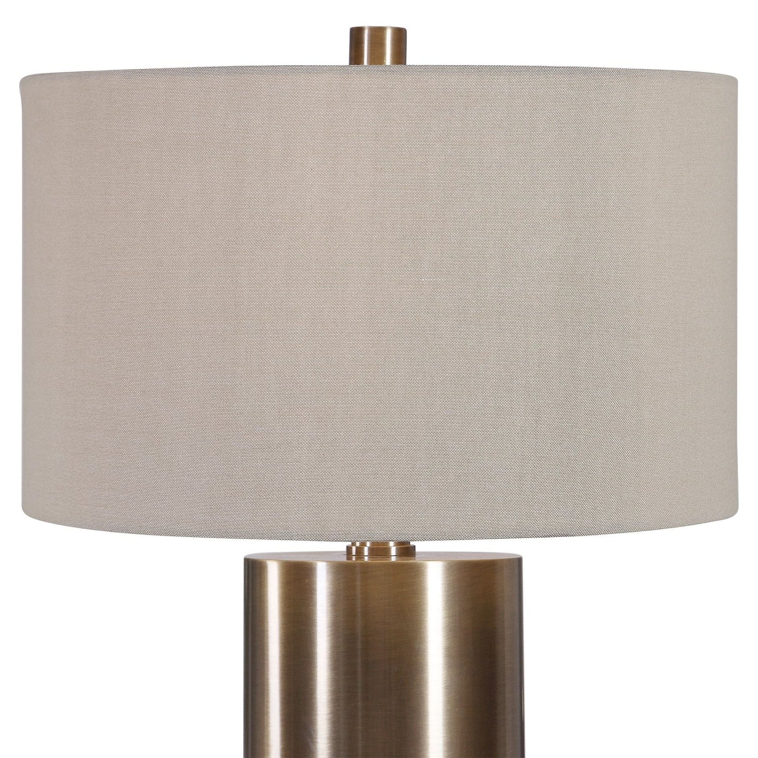 - Finished In An Antiqued Brushed Brass, This Table Lamp Keeps It Simple Yet Upscale With A Large Metal Cylinder Base With Matching Accents.