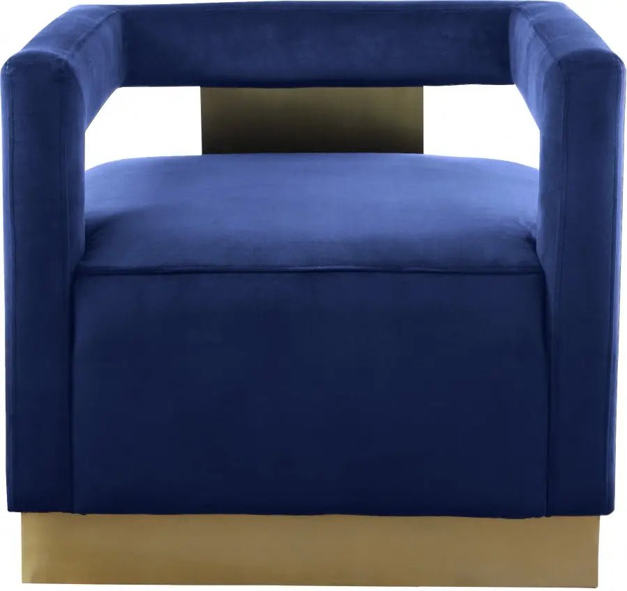Liven up your living quarters with this unique Armani Navy Velvet Accent Chair from Meridian Furniture. Featuring a square frame design with right angle openings at the arms and back, this chair puts the “mod†in modern. Rich navy velvet upholstery gives the chair a soft, comfy texture that you’ll want to get cozy with, and its gold steel base and back complements its upholstery while providing solid support. This chair is the perfect addition to any room in your contemporary home.