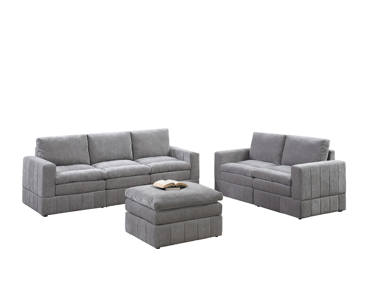 A triple layer cake comes to mind with this extraordinary designed modular sectional set. Each piece is crafted with three tiers topped with plush pillow-top seating and back support to match. Go straight to the moon with this 6-piece set that provide comfort and style that is out of this world. Explore your options with a traditional sectional or try a loveseat, sofa and ottoman combo to suit your style and comfort. This set includes two of each of the following: Right/Left one-arm chair, armless chair, and ottoman. Available in a smooth suede-like fabric in granite and mink.
