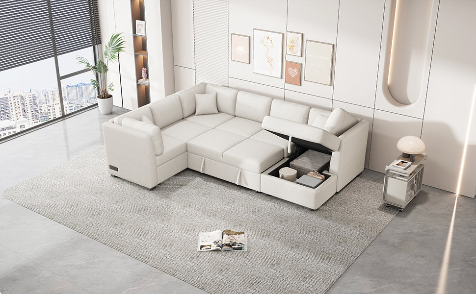 Beige U-shaped Sectional Sofa Pull Out Sofa Bed with USB Ports, Power Sockets, Back Pillows, Storage Chaise