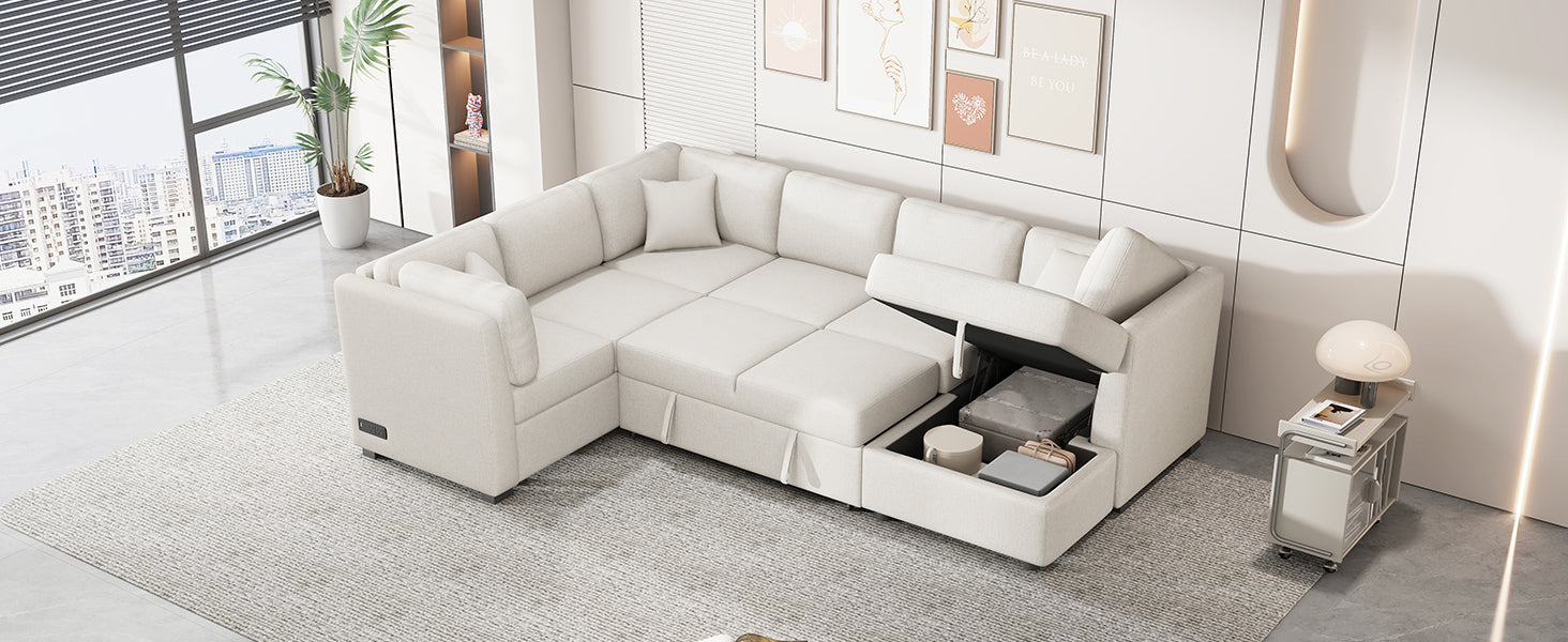 Beige U-shaped Sectional Sofa Pull Out Sofa Bed with USB Ports, Power Sockets, Back Pillows, Storage Chaise is available