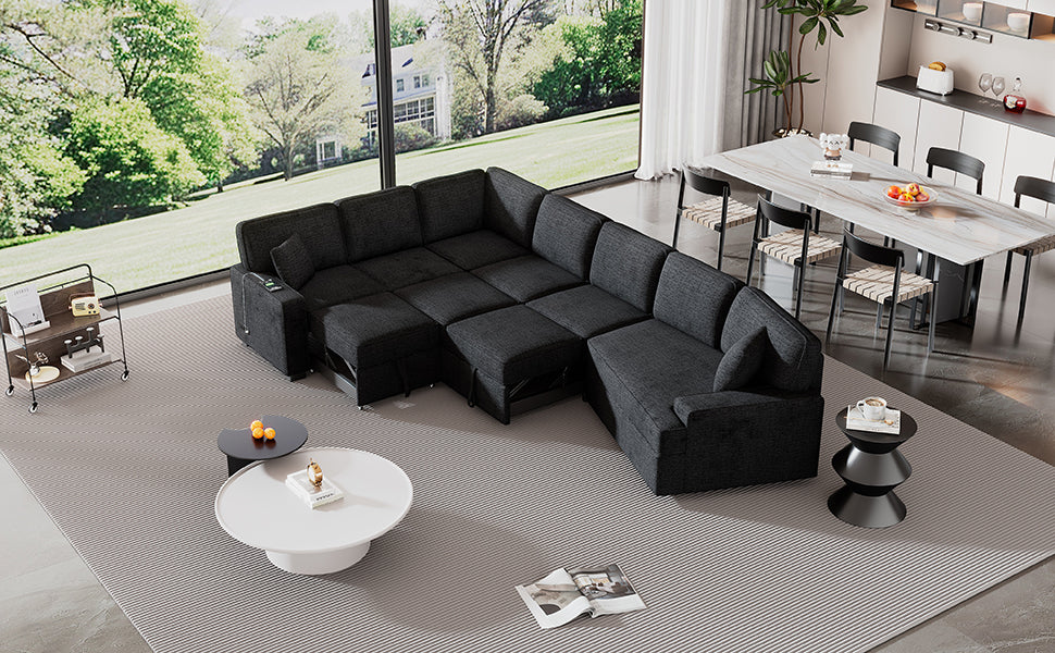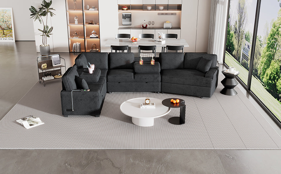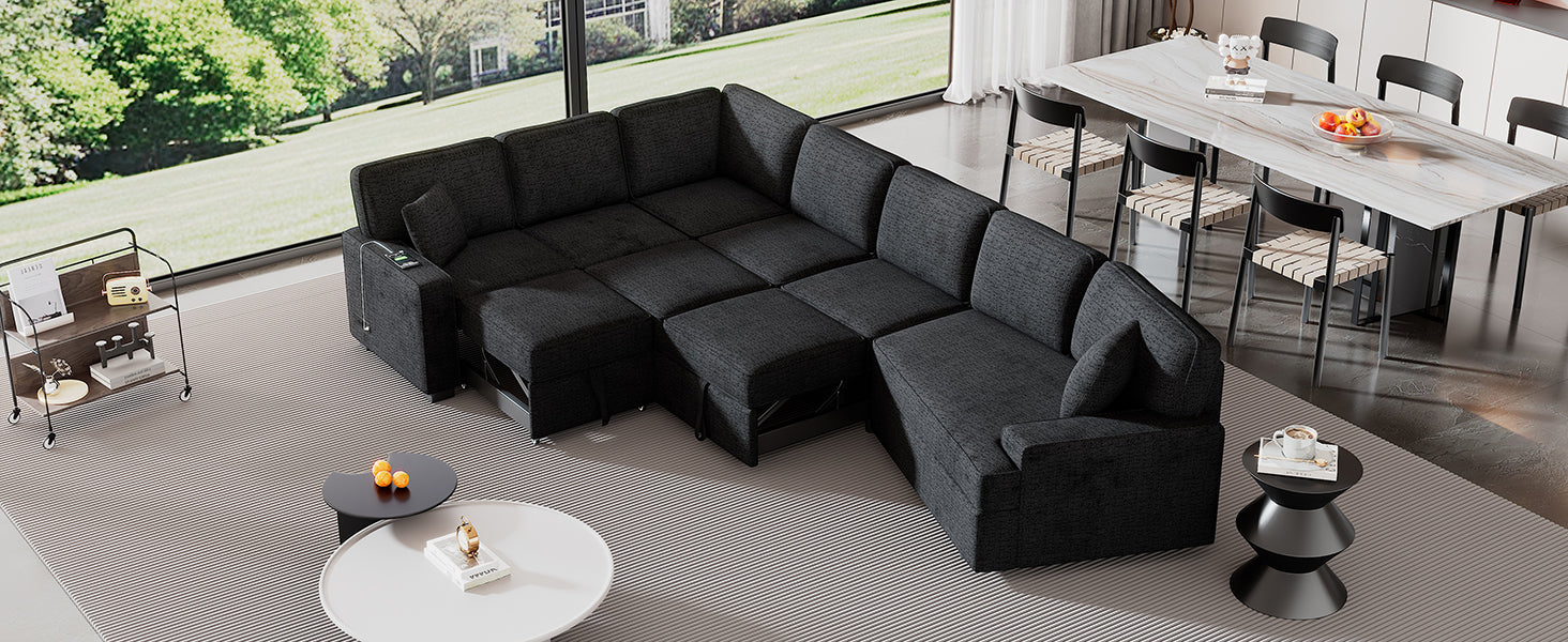 Modern L-shaped Sofa Sectional with Pull-out Bed, Charging Devices, Cup Holders, Blue Black Chenille, 126 inches is available