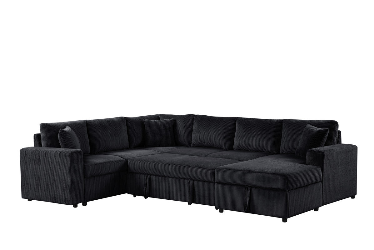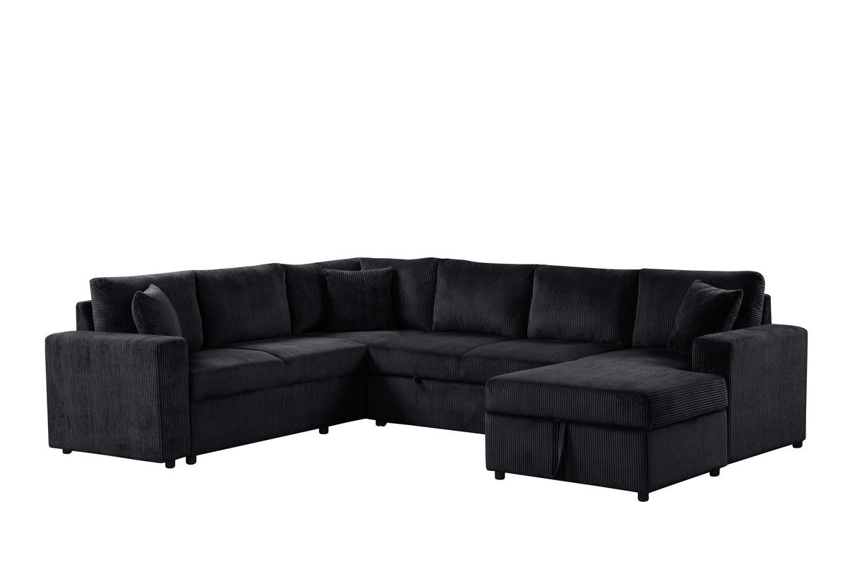 Rinaldo 123'W Black Corduroy Sleeper Sectional Sofa with Right-Facing Storage Chaise and Throw Pillows is available