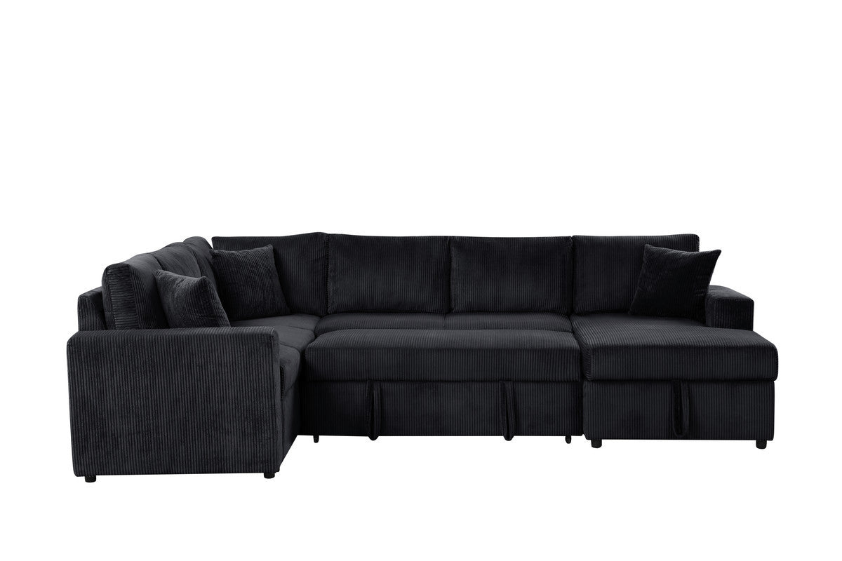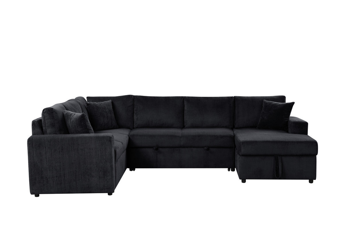 Rinaldo 123'W Black Corduroy Sleeper Sectional Sofa with Right-Facing Storage Chaise and Throw Pillows