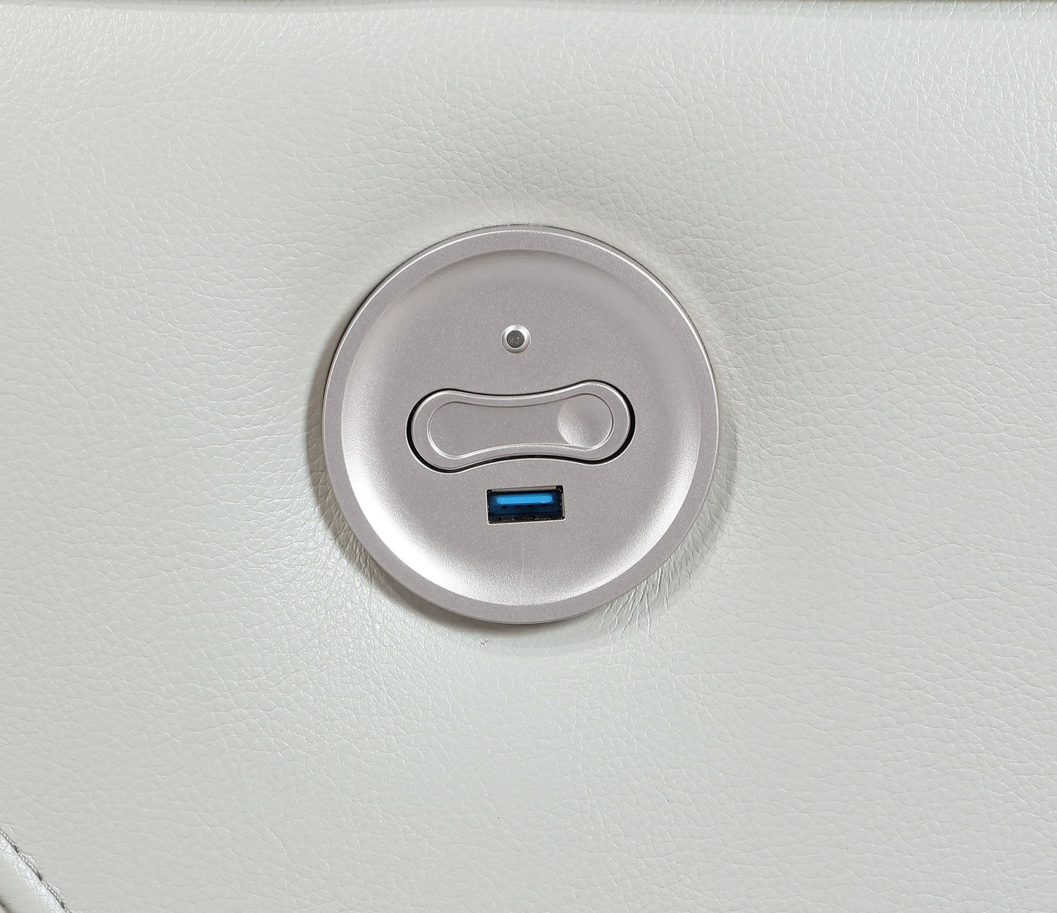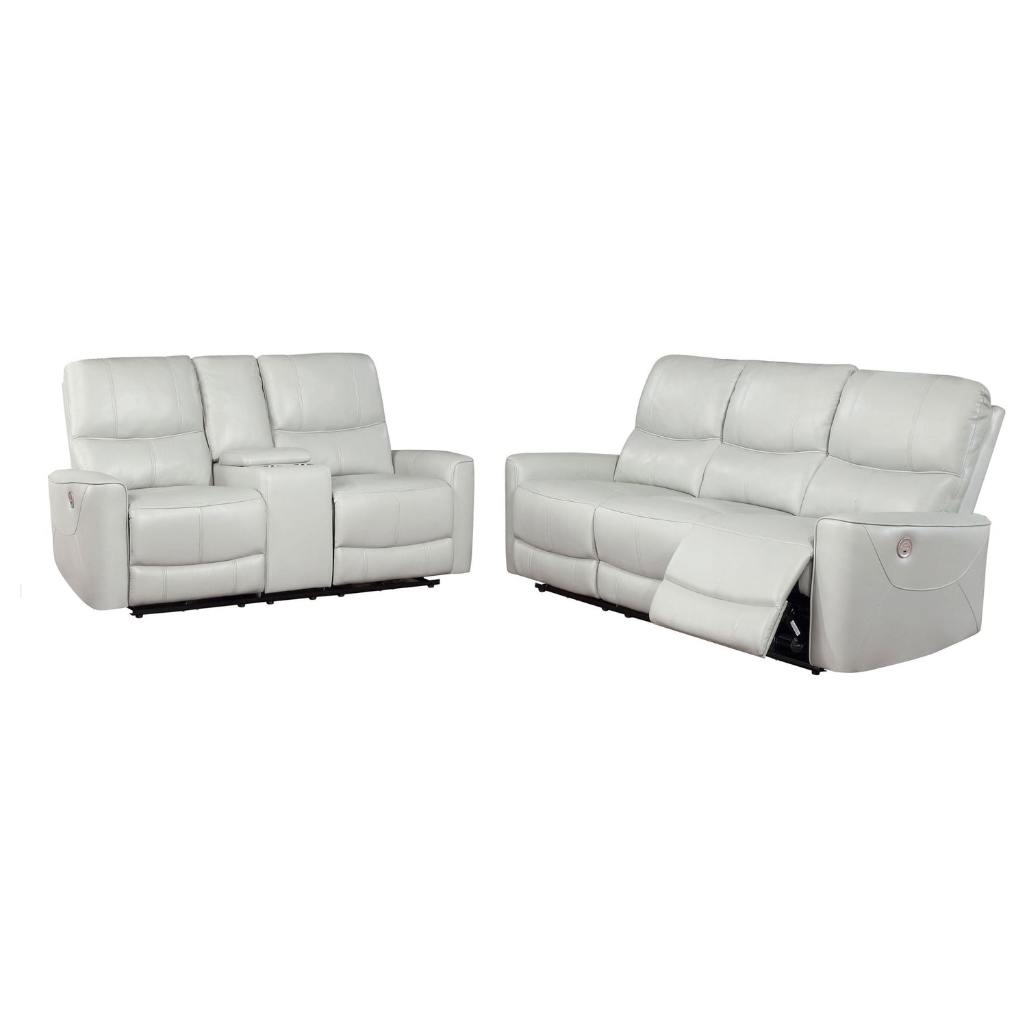 Contemporary elegance plays out in a clean, modern design as the two-piece power sofa set delivers beauty and comfort to a space reserved for easy entertaining and relaxing. Ivory leatherette upholstery covers wood framing to provide a sturdy build, embellished with plump foam fill in tall, attached back cushions and supportive seat cushions. Embrace subtle tufting on this power sofa and loveseat set creating customized body positioning accessible at the touch of buttons on switch panels with convenient USB ports. Keep beverages within reach and store essentials in a center-mounted loveseat flip-top console and panel. This power set is all that's needed for a relaxing day or evening.