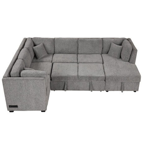 Beige Chenille U-Shaped Sectional Sofa with Pull-out Bed, USB Ports, Storage Chaise & Back Pillows