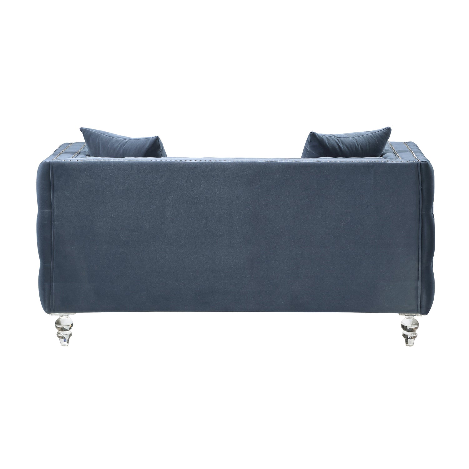 Glamorous from top to bottom, the Orina Collection exemplifies the radiant styling that defines your personal style. From the nailhead accent, dark blue velvet button-tufted cover, down to the acrylic legs that support the sofa, love seat and chair, each classic accent culminates to achieve the elegant aesthetic you desire for your home’s décor.