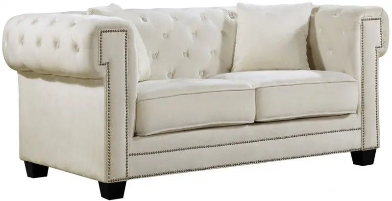 The Bowery Collection by Meridian Furniture. Features beautifully designed tufted velvet upholstery with custom wood legs and a nail head trim. This collection is guaranteed to be the highlight of any home. Throw pillows included.