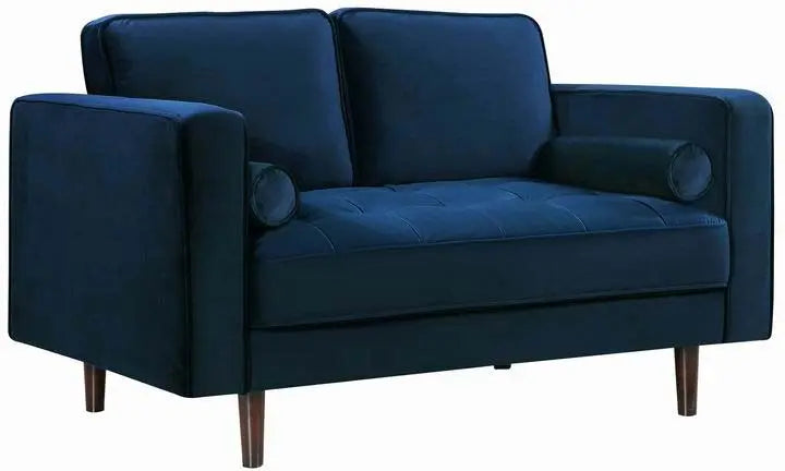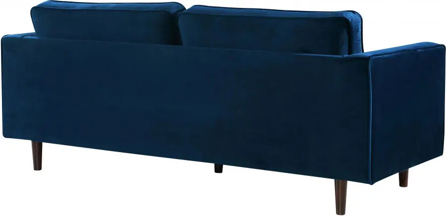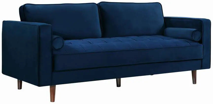 Stretch out and relax on this handsome Emily collection. This Meridian Furniture collection features wooden legs and a sturdy frame, so it's built for the long haul. Its vibrant Navy velvet upholstery is a jewel tone that's simply stunning and that adds a pop of color to your day. The back cushions are plump and filled with premium material to cradle you in comfort, and it comes with two roll-style pillows for helping you prop up and unwind.