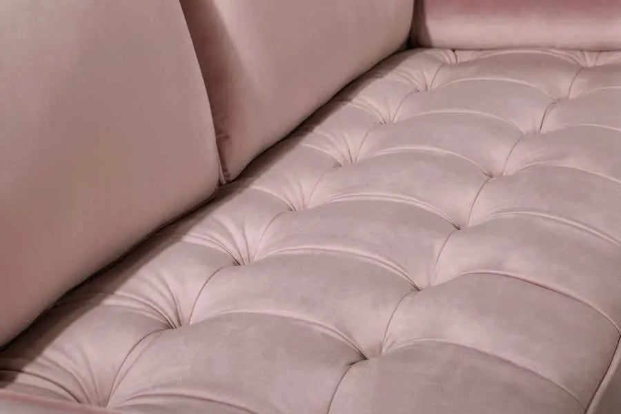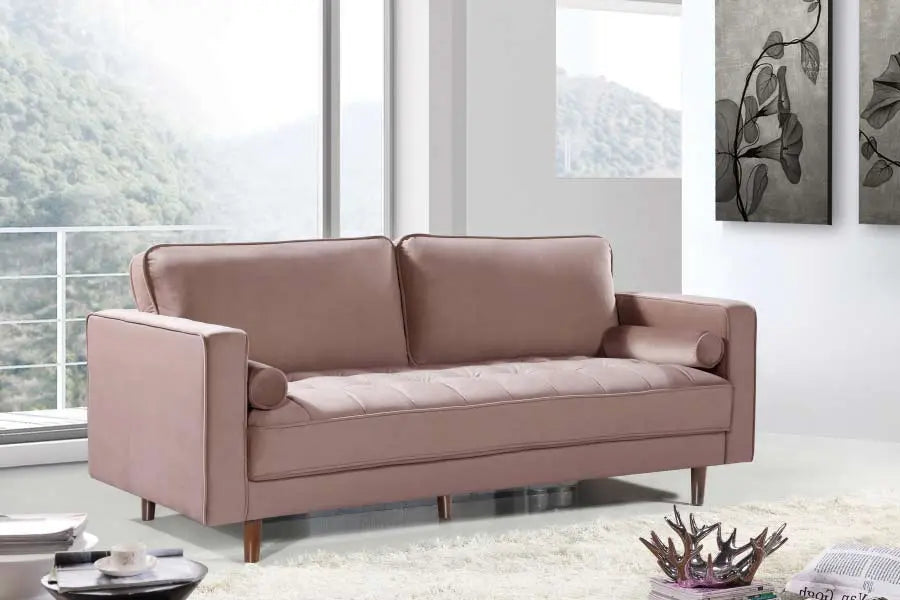 Stretch out and relax on this handsome Emily collection. This Meridian Furniture collection features wooden legs and a sturdy frame, so it's built for the long haul. Its vibrant Pink velvet upholstery is a jewel tone that's simply stunning and that adds a pop of color to your day. The back cushions are plump and filled with premium material to cradle you in comfort, and it comes with two roll-style pillows for helping you prop up and unwind.