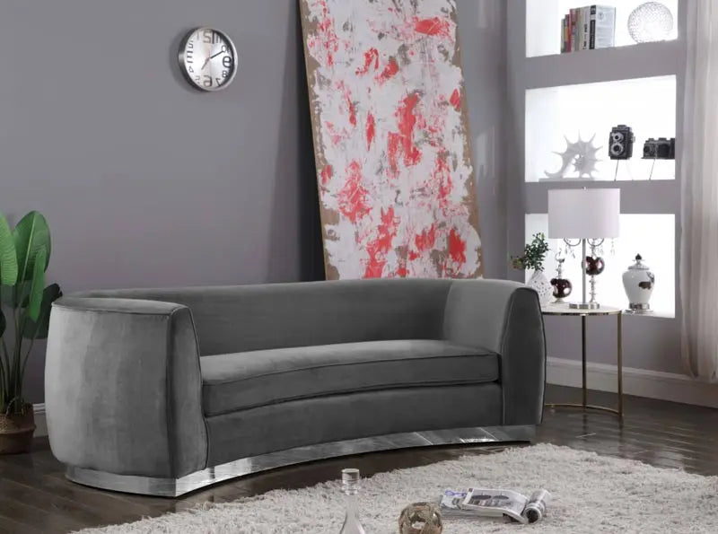 The Julian Collection by Meridian Furniture. Features beautifully upholstered velvet with a curved shiny chrome stainless steel base. Using the highest quality velvets this set is sure to stun your guests.