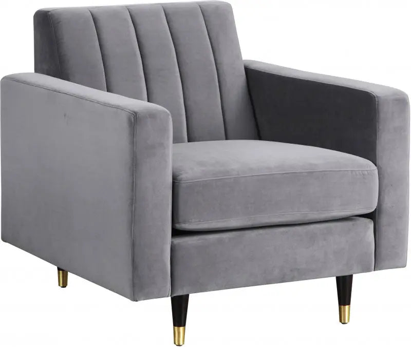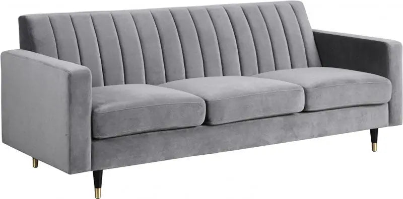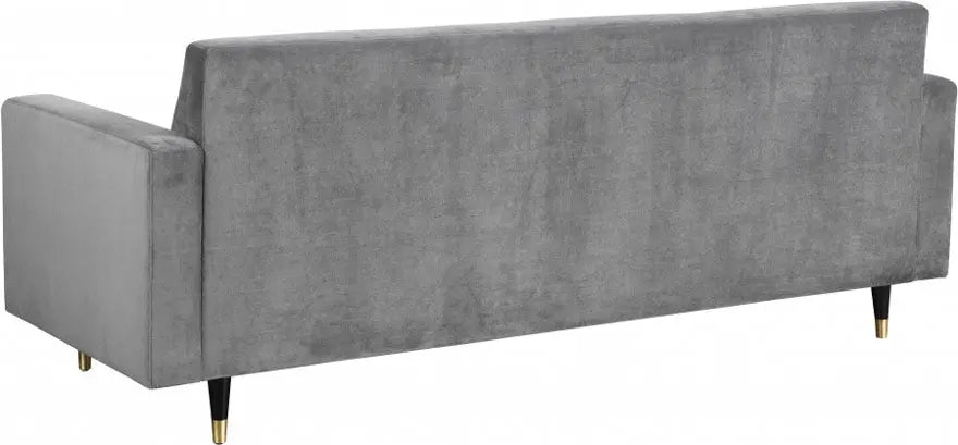 Cozy up to the comfort of this Lola Grey Velvet Living Room Collection. Its rich color adds a jolt of excitement and fun to your space, shaking things up in a neutral-colored room. The back is channel tufted for a beautiful, contemporary look and to help the back cushioning maintain its welcoming loft. Elegant slant-tipped black legs with gold tips lend this sofa a charmingly modern finish and provide a sturdy foundation.