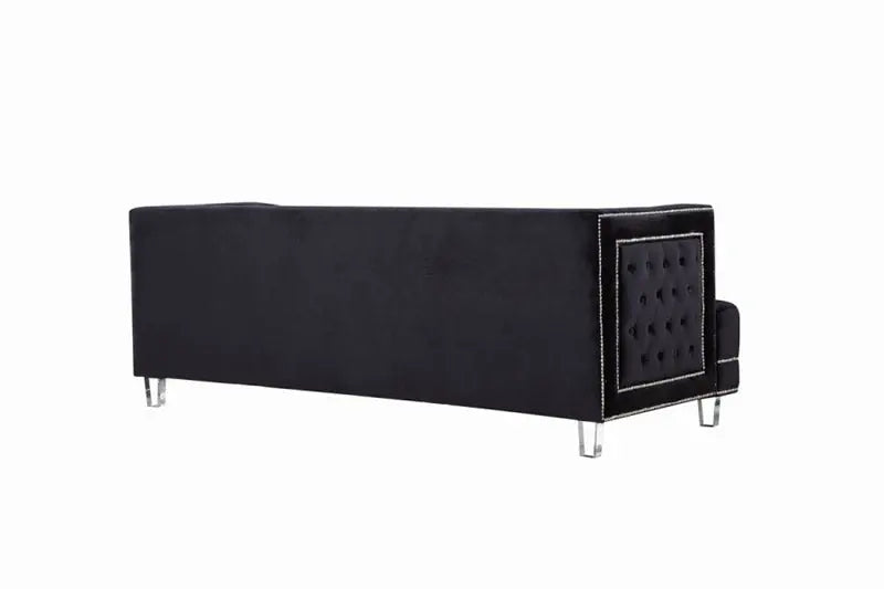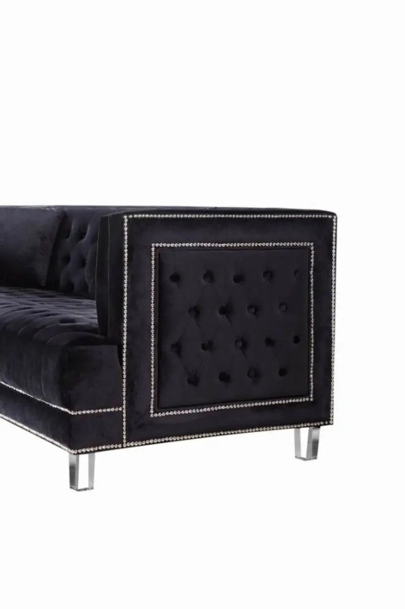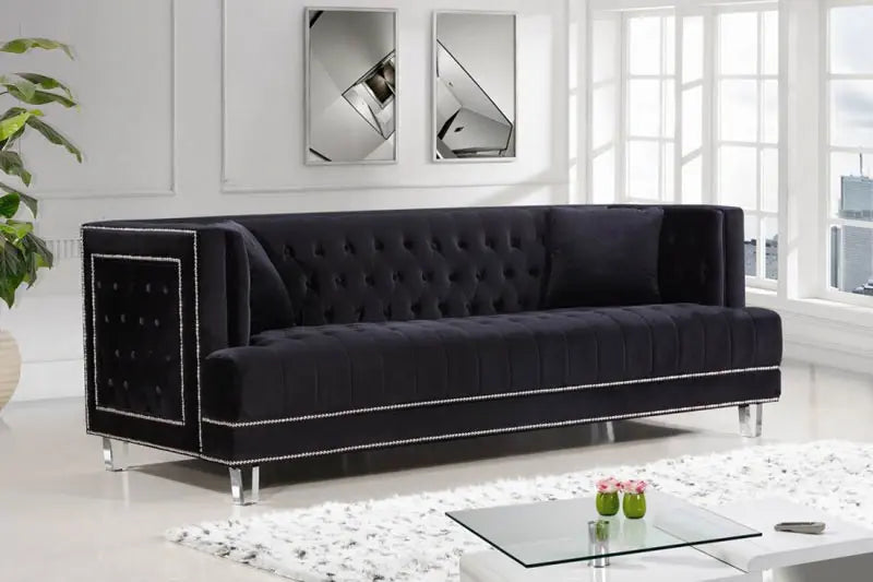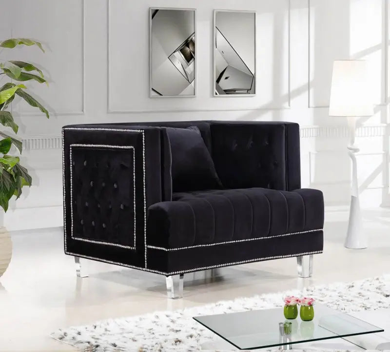 The Lucas Collection by Meridian Furniture. Features beautifully tufted velvet upholstery with a custom nail head design and clear acrylic legs. This collection is guaranteed to be the highlight of any home.