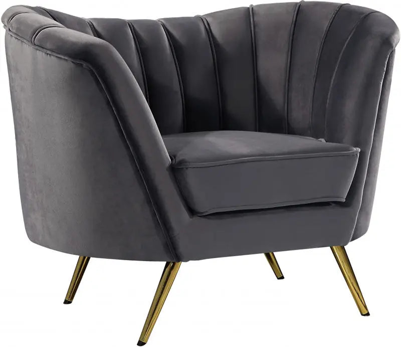 Lean back and lounge in luxurious style on the stunning Grey velvet Margo living room collection by Meridian Furniture. This contemporary collection features plush velvet upholstery that is both classy and sumptuous against your skin, a single seat cushion and rounded arms that curve into a low, rounded back, creating a perfect, modern piece for your home. Gold stainless steel legs support this collection and provide stunning contrast to the plush, black fabric.