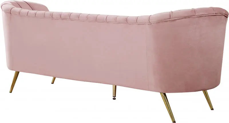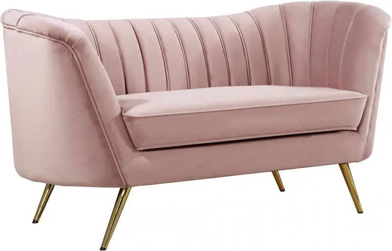 Lean back and lounge in luxurious style on the stunning Pink velvet Margo living room collection by Meridian Furniture. This contemporary collection features plush velvet upholstery that is both classy and sumptuous against your skin, a single seat cushion and rounded arms that curve into a low, rounded back, creating a perfect, modern piece for your home. Gold stainless steel legs support this collection and provide stunning contrast to the plush, black fabric.