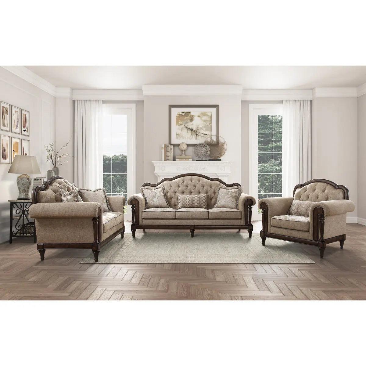 Crafted from solid hardwood in a brown oak finish, this loveseat features premium chenille fabric upholstery with deep tufted detailing. The carved wood accents and polished texture elevate its classic aesthetic while ensuring long-lasting strength and durability.