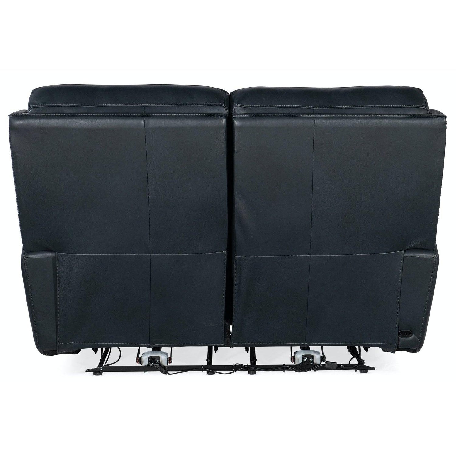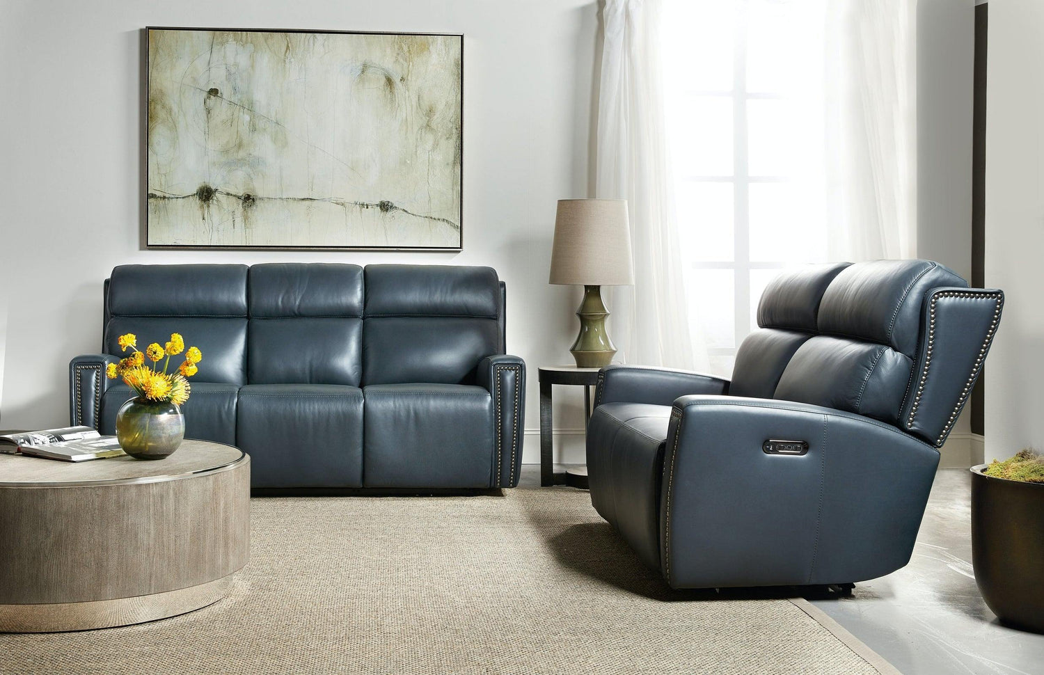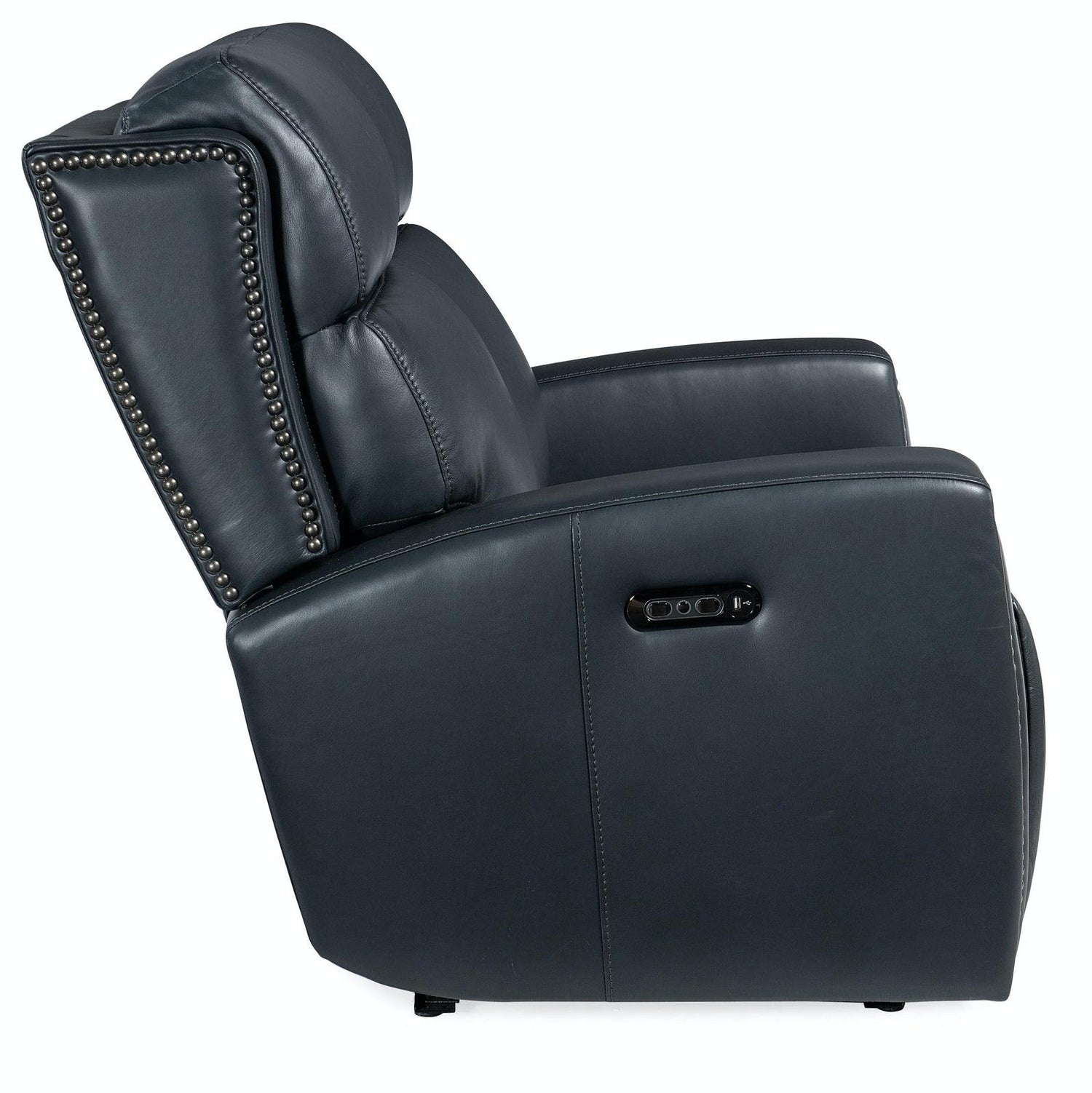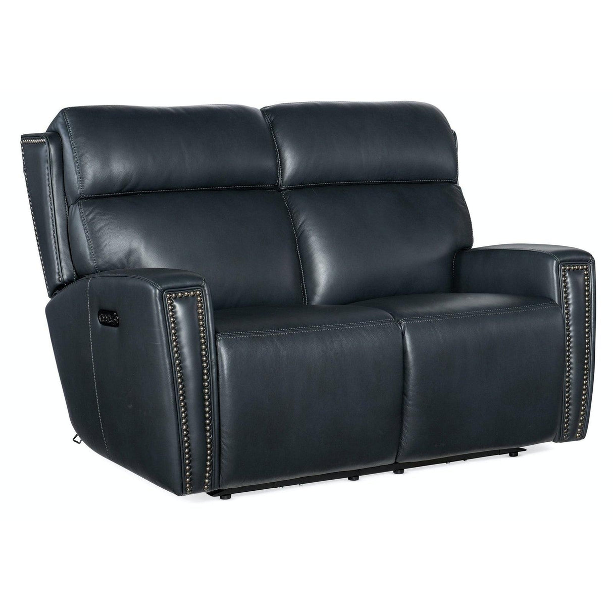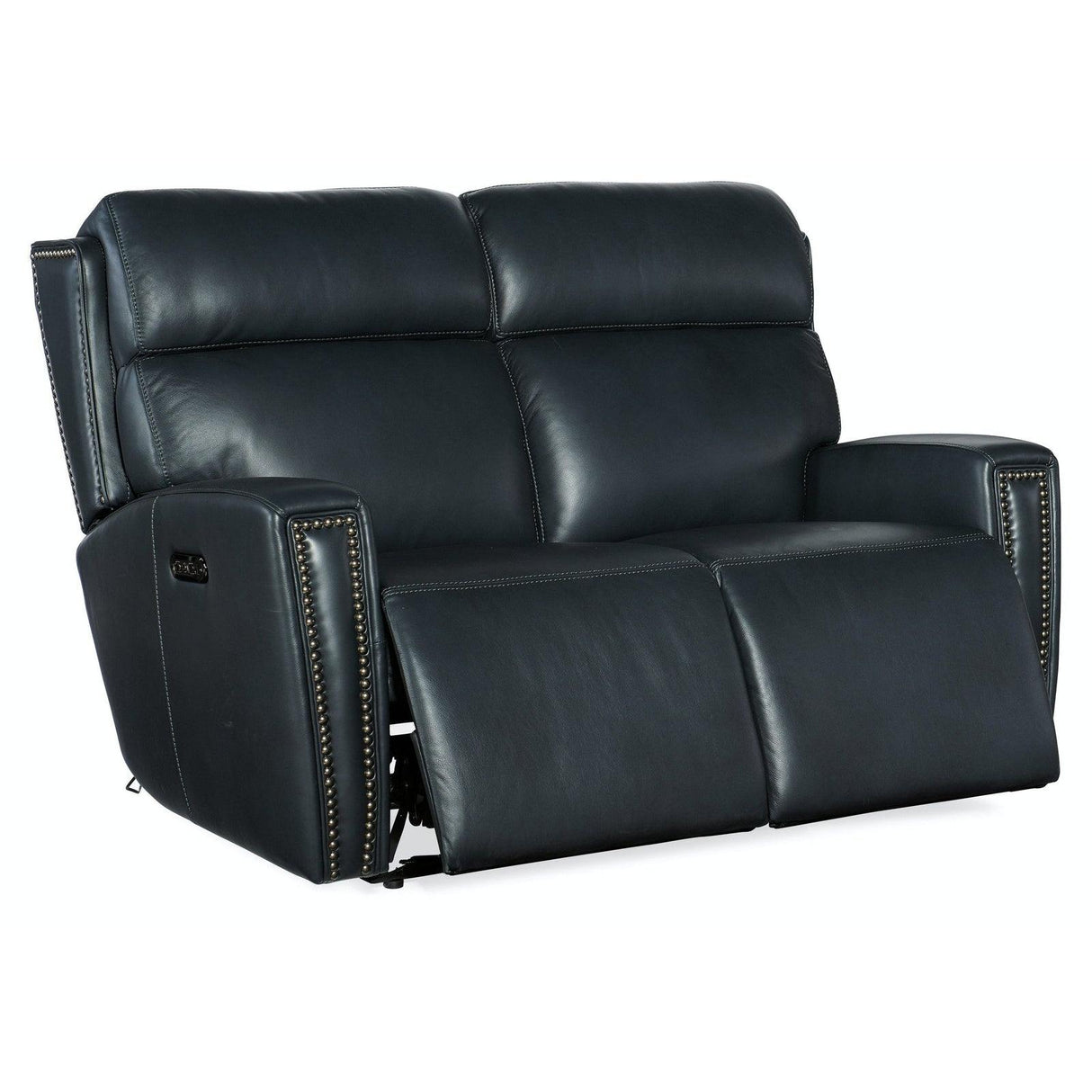 Elegant yet approachable, the Ruthe Zero Gravity Power Reclining Loveseat by Hooker Furniture fuses vintage charm with modern technology. Wrapped in Derrick Honey semi-aniline top-grain leather, this two-seat reclining loveseat offers deep comfort and timeless appeal with a bustle-style back, brass nailhead trim, and gently sloped arms evoking a modern wingback silhouette.