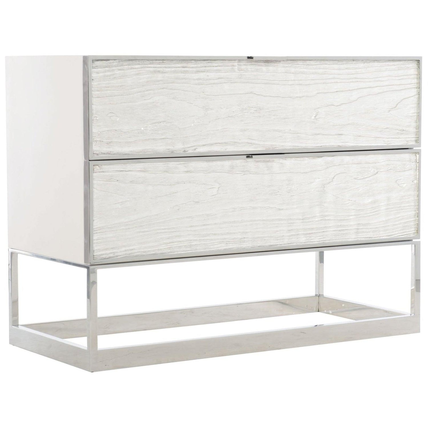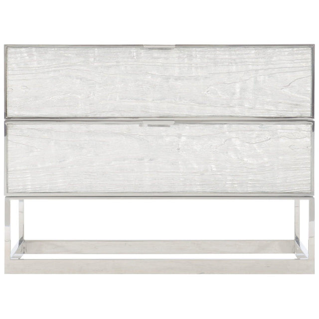 The Parkhurst Nightstand by Bernhardt brings a bold touch of glam style to the bedroom. With its high-sheen white lacquer finish, polished stainless steel frame, and lustrous silver-leafed drawer details, this piece radiates contemporary luxury. Two drawers framed in stainless steel feature finger pulls and inset faux wood-grain acrylic fronts backed with silver leaf, balancing elegance with practical bedside storage.
