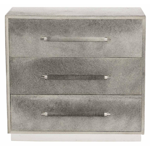 The Parkin Nightstand by Bernhardt elevates bedside storage with its natural texture and luxurious details. Wrapped in gray hair-on-hide with refined saddle stitching, this nightstand exudes modern eclectic charm. Three drawers with white-painted interiors and white felt lining bring elegance and utility, while a polished stainless steel plinth base adds sleek contrast and stability.