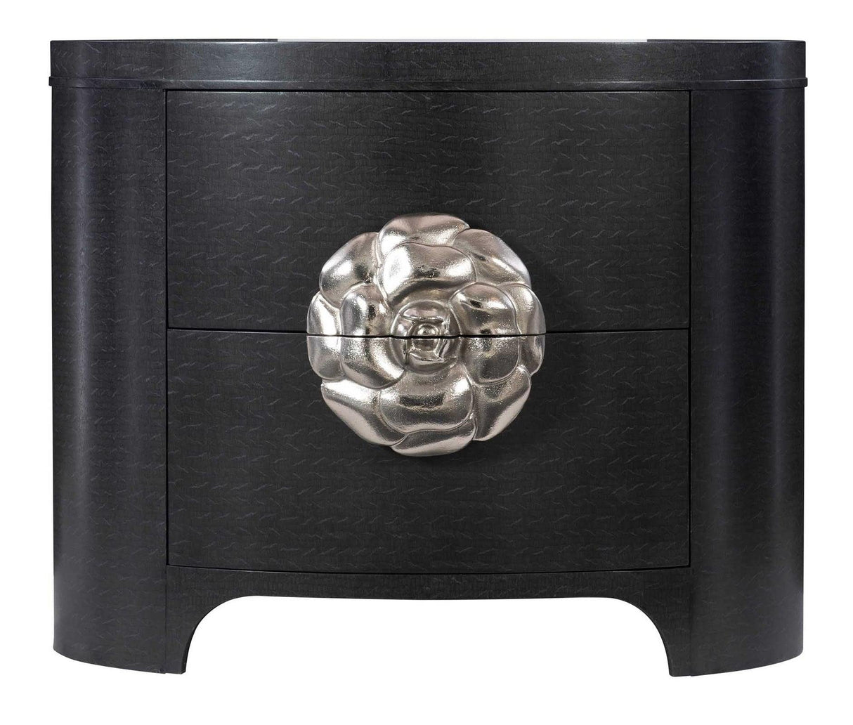 The Silhouette Nightstand by Bernhardt is a striking piece defined by bold contrast, feminine detailing, and a touch of Hollywood Regency glamour. Crafted from anigre wood in a Figured Onyx finish, the oval case exudes modern sophistication. The true centerpiece is an oversized flower-shaped camellia pull in cast aluminum, adding natural mystique against the dark, textured backdrop. With two soft-closing drawers, this nightstand offers both beauty and function for contemporary bedrooms.