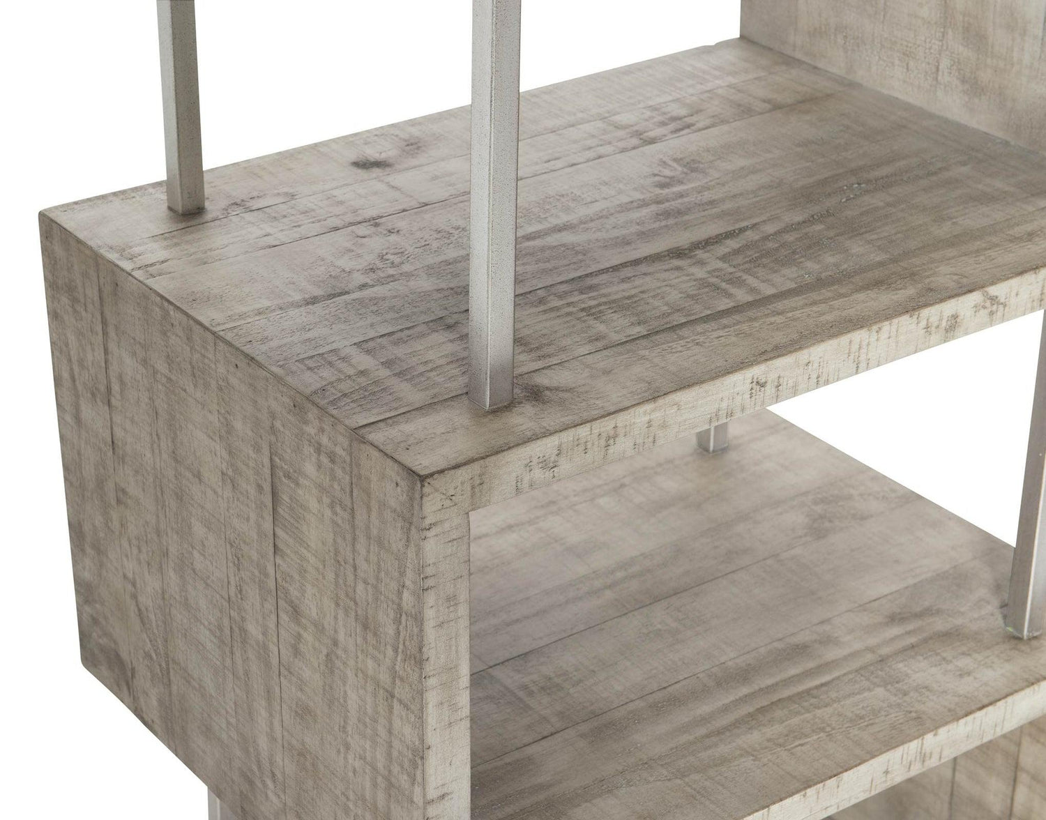 - Tubular stainless steel support posts between shelves and metal feet in glazed silver finish