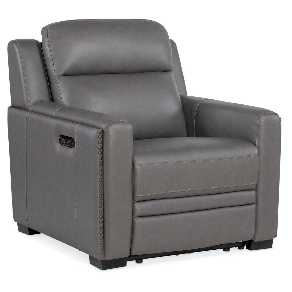 The McKinley Power Recliner by Hooker Furniture blends transitional elegance with maximum comfort. Upholstered in top grain Candid Spice leather, this recliner features Power Recline, Power Headrest, Adjustable Lumbar, and a built-in USB port—ideal for modern relaxation. Designer details like a bustle-style back, nailhead trim, and wood legs complete its refined silhouette.