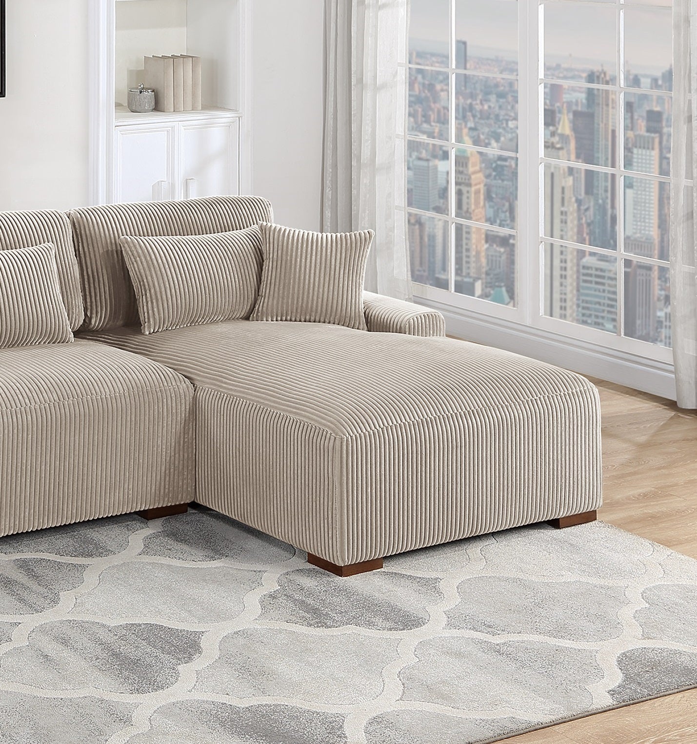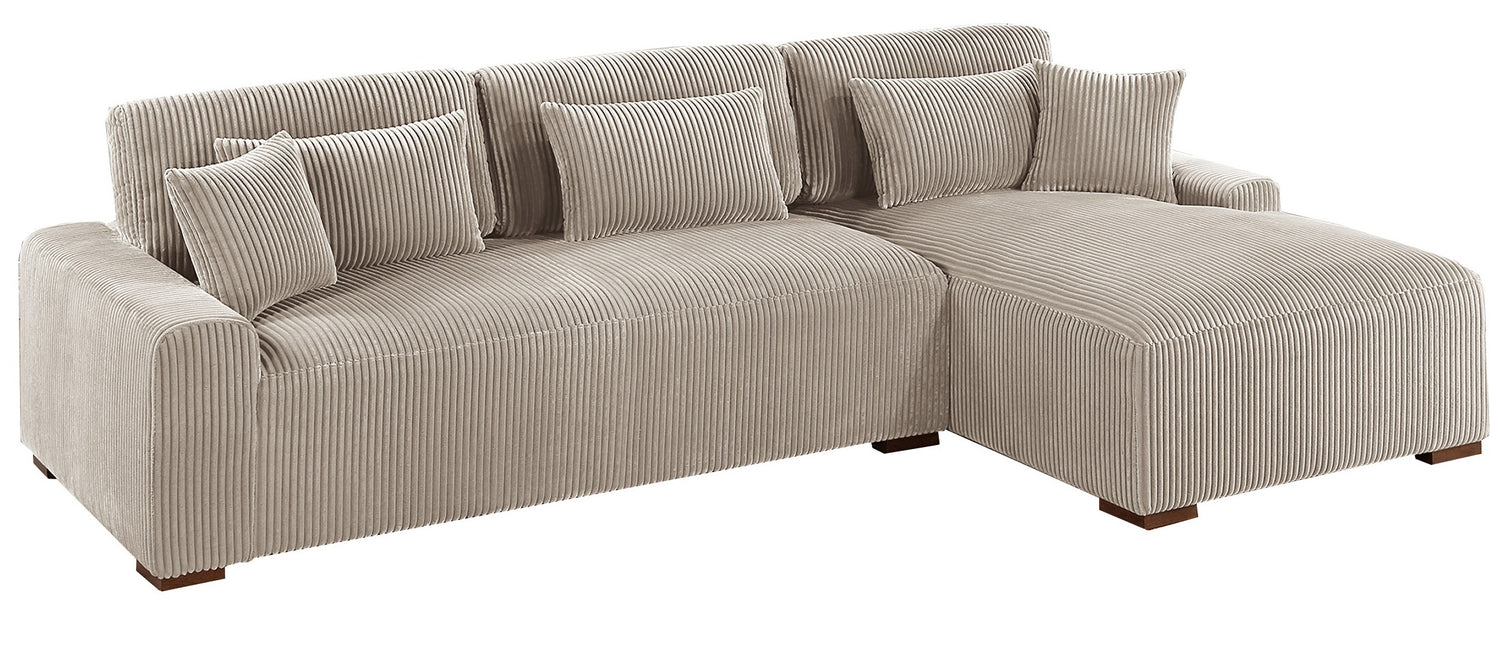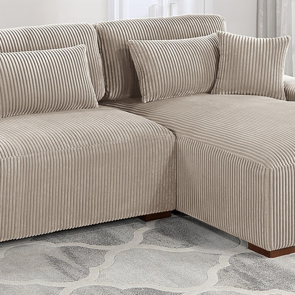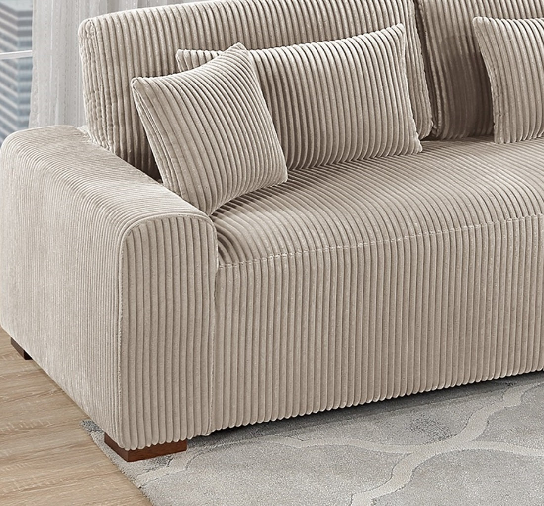 Whether you're hosting a movie night with friends or simply unwinding after a long day, this 2-Piece Sectional Set offers the perfect combination of style and comfort. The plush corduroy fabric is luxuriously soft and inviting, perfect for creating a warm and cozy atmosphere in your living room. Featuring clean lines and a modern silhouette, perfect for complementing any living space. The squared arms add a touch of sophistication, while the low-profile legs create a sleek, contemporary look. The attached seat cushion streamlines the design and provides a smooth seating surface. This set comes complete with five accent pillows mix and match the pillows to create a look that reflects your unique taste.
